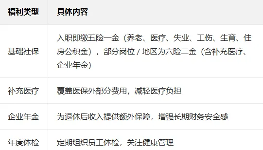 福利完善(六险二金、补充医疗、年度体检等),可显著提升综合收益。
