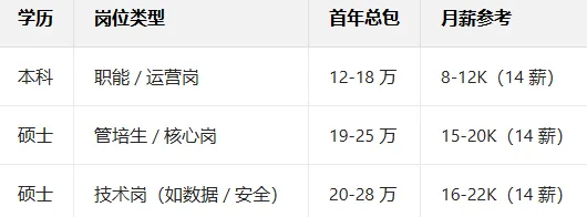 内地一线(北京、深圳):薪资最高,本科 15-25 万 / 年,硕士 19-30 万 / 年。
