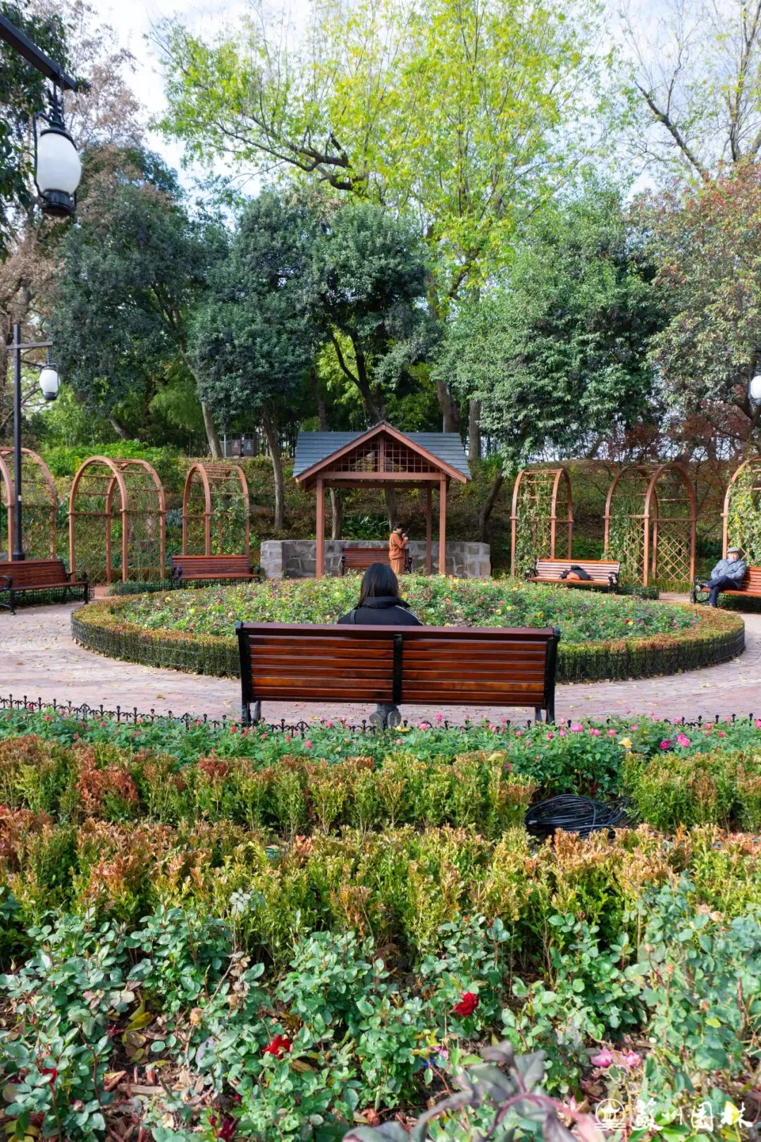 玫瑰园引种新优月季品种,搭配精致廊架与座椅,化身浪漫花海,花园的绚烂与周边绿意无缝衔接。