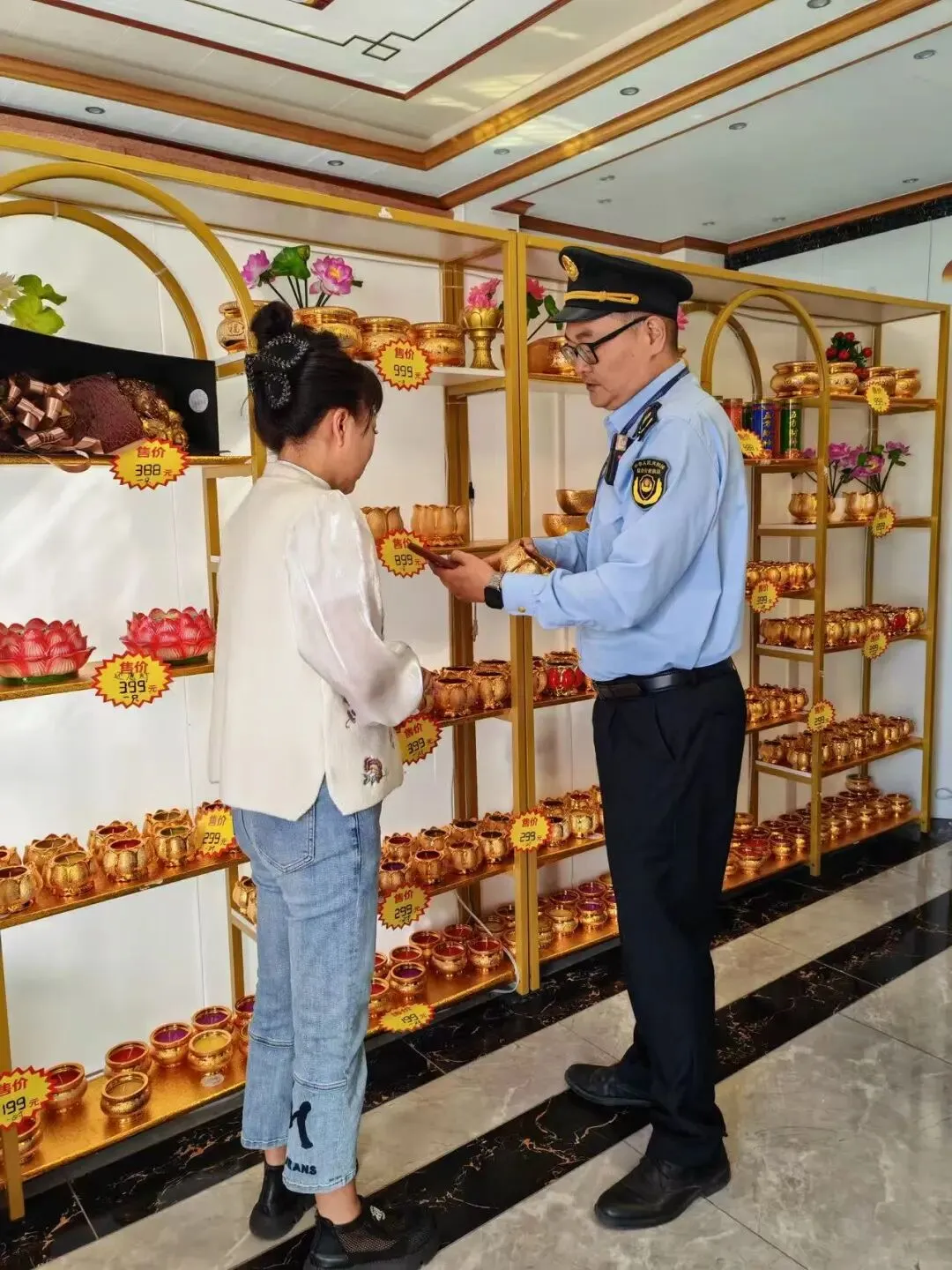 行动中,执法人员对南山文化旅游区周边5家鲜花香烛经营门店开展执法检查,重点检查营业资质、进货票据及台账、明码标价情况及是否存在欺诈消费及商业贿赂等违法违规行为。以“劝导为主、处罚为辅”的执法原则,现场责令2家进货台账不全、4家违规粘贴宗教宣传材料的商户立即整改,并同步开展相关法律法规普及宣传,督促严格落实主体责任。