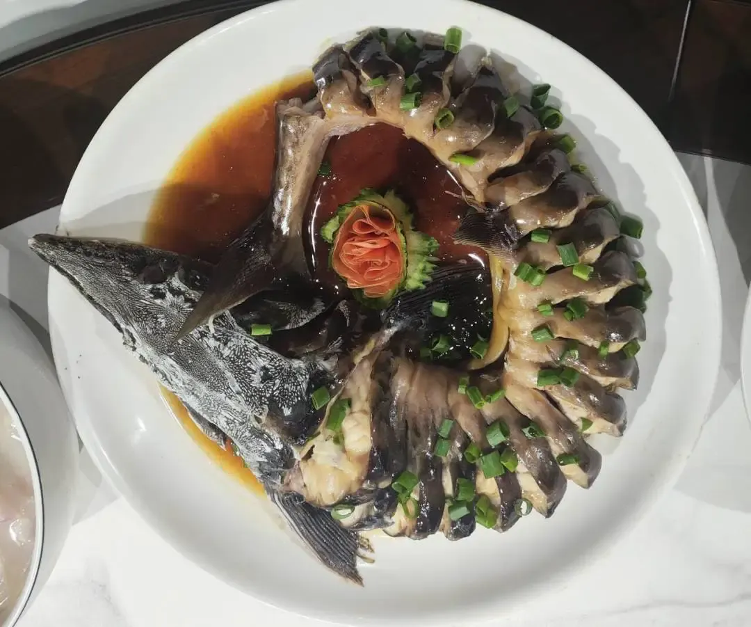 鱼肉肉质鲜嫩,清蒸的做法最大程度地保留了其原汁原味,口感层次丰富;此外,鲟鱼富含优质蛋白质与不饱和脂肪酸,营养丰富,对人体健康大有裨益。