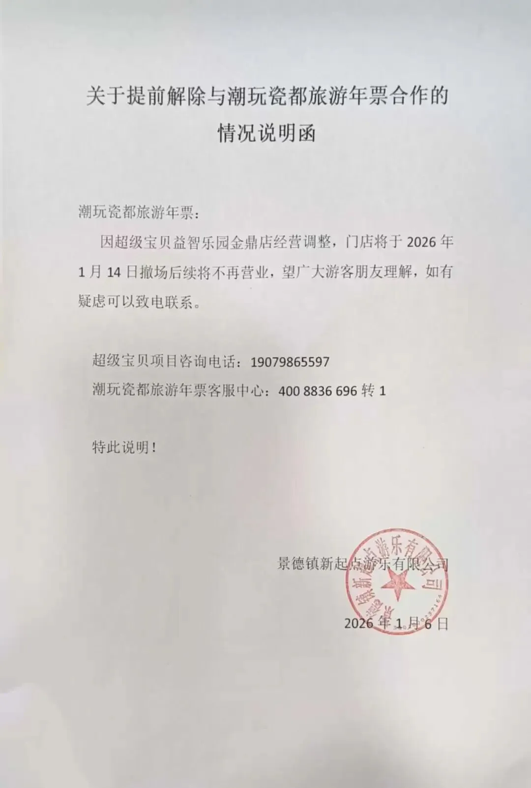 因景区经营调整,门店将于2026年1月14日起正式终止运营并撤场。潮玩瓷都旅游年票有效用户在2026年1月13日及之前可正常入园,1月14日起年票无法在该景区使用,由此给大家带来不便敬请谅解,感谢您的理解和支持。