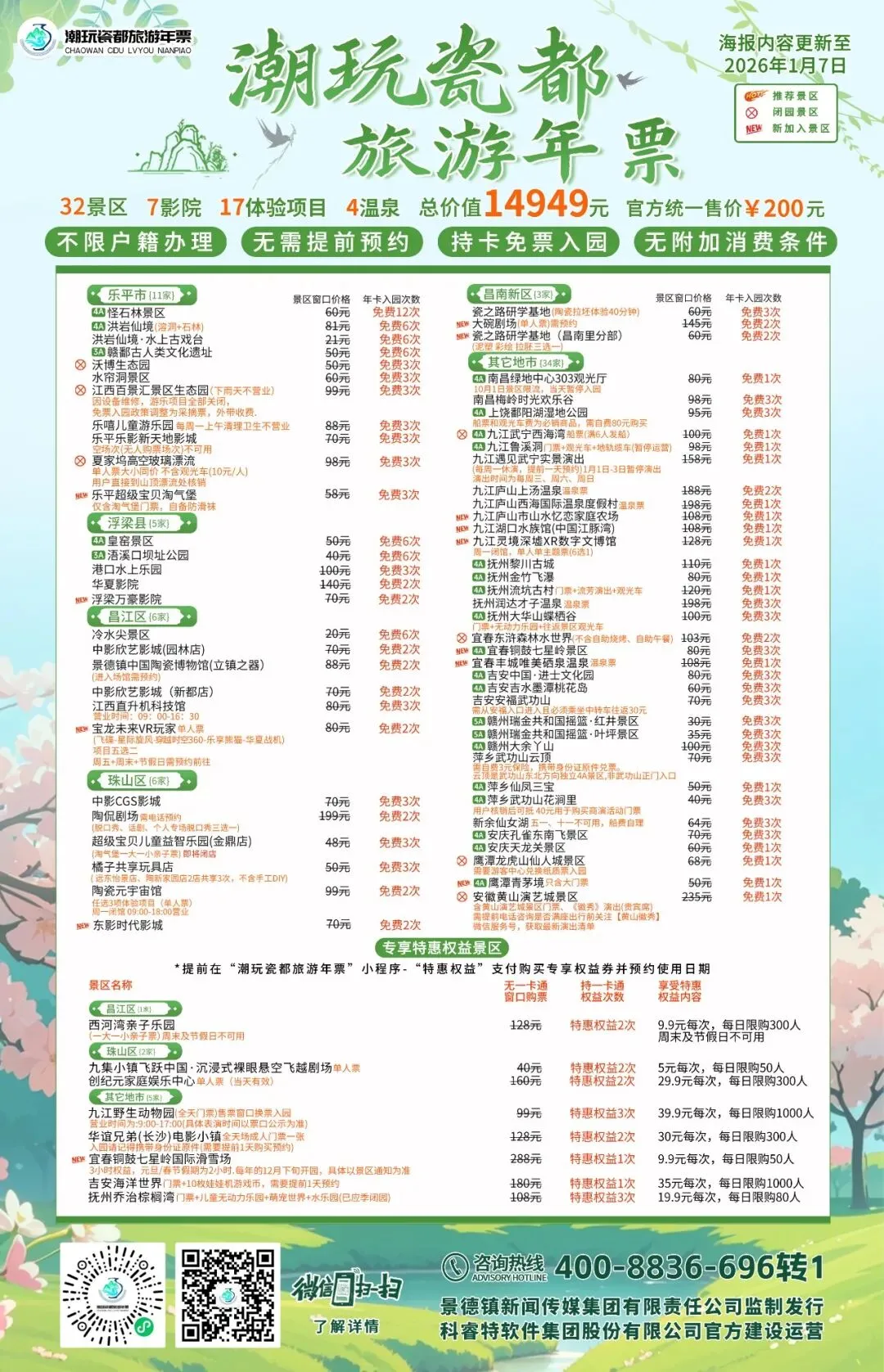 为了保障大家的出行及观演、观影体验,请在出行前拨打潮玩瓷都旅游年票客服热线400-8836-696转1或者拨打景区电话咨询是否营业,且随时关注“潮玩瓷都i旅游”官方公众号以及用户会员群内消息,并相互转告。 如有任何问题,可拨打客服咨询热线:400-8836-696转1,客服热线服务时间为:8:30-21:00。 潮玩瓷都旅游年票建设运营中心