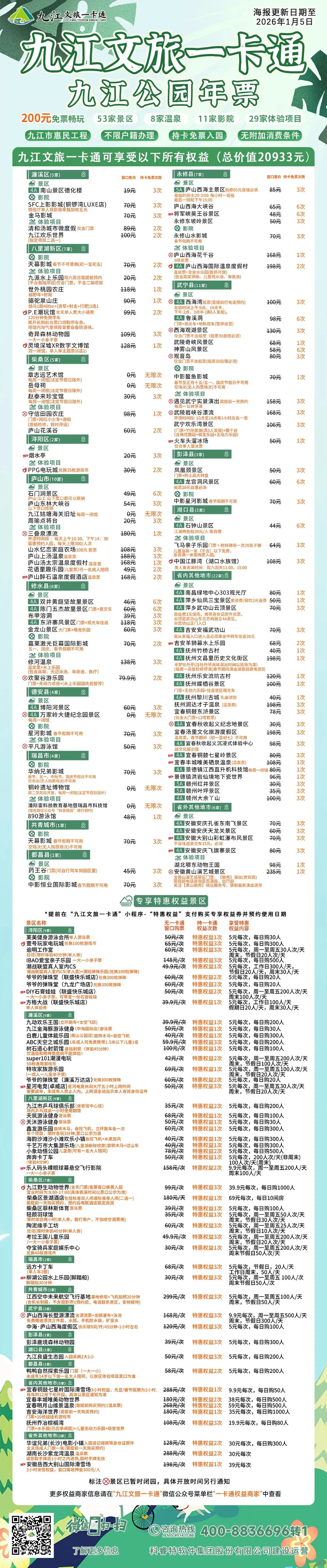 九江文旅一卡通建设运营中心会根据九江文旅一卡通运营需求,不断围绕用户的体验来增加一卡通的附加值,会持续新增更多的景区以及权益商家让用户得到更好的体验,也会根据实际运营的情况和各景区的合作签约情况进行部分合作景区的服务内容调整(含部分景区中止合作退出的情况),请知悉!