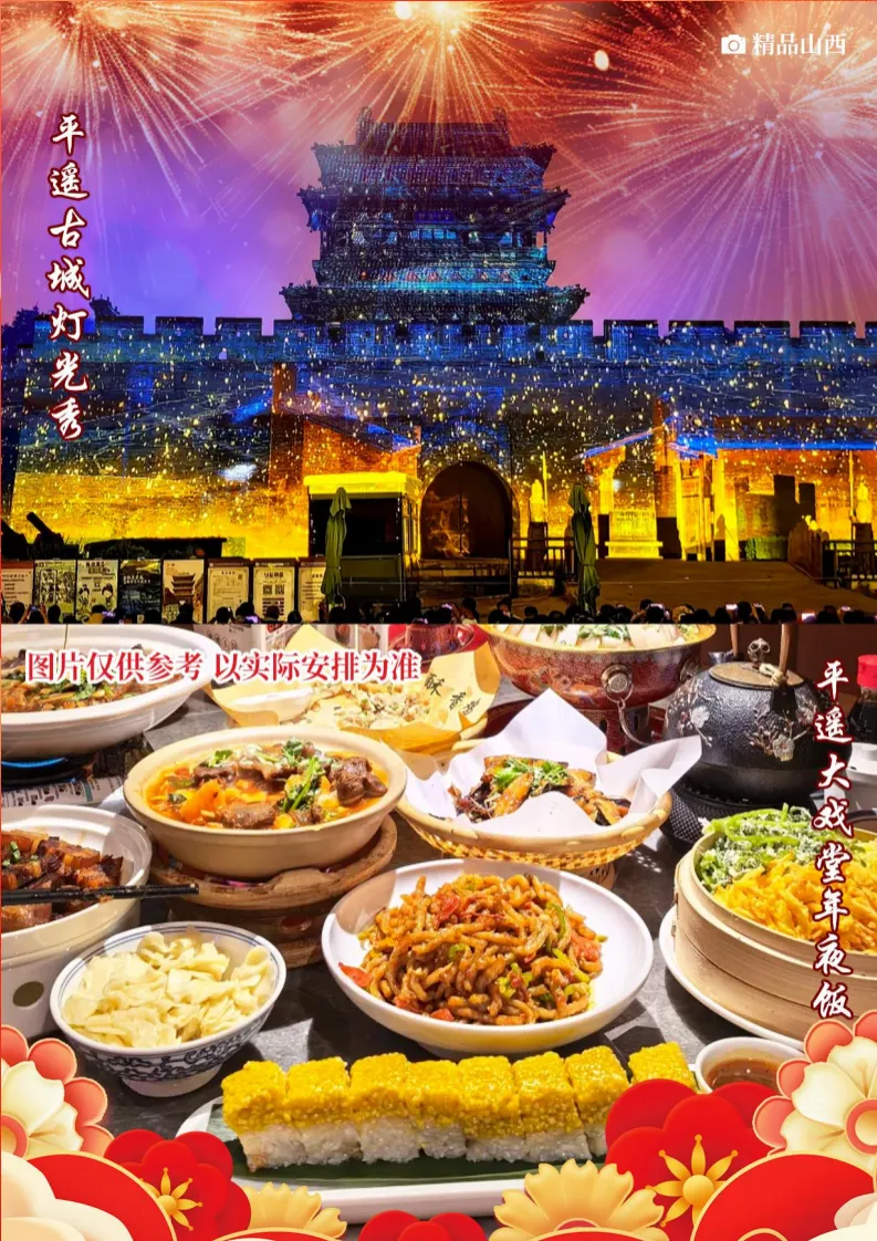 早餐后,游览【平遥古城】(游览时长 3H)平遥古城至今已有 2800 年历史,是国内现存最完整的一座古代县城行走其间看飞檐翘角的阁楼,漫步于幽深巷道里的青石斑斑,雨天的清晨街道无华院门静谧,历史沿着古城墙上蜿蜒斑驳娓娓而来,必打卡景点:【日昇昌票号】,中国现代银行开端,这座小小院落,曾经操纵着清王朝的经济命脉,三进式穿堂楼院,极具山西特色【明清一条街】坐落在古城中轴线上,这里完整地保存着明清时期的店铺遗迹,是古城最繁华的商业街区【平遥古城墙】中国现存最完好的四座古城墙之一【平遥古县衙】每日有县太爷升堂、断案表演,提前做好表演时间等攻略哦~【文庙】有"小故宫"之称,登上魁星楼平遥古城尽收眼底 午餐后,乘车前往【小西天】(游览时长 1.5H)中国悬塑绝唱《黑神话:悟空》隰县小西天取景,天命人打卡网红景点,这里有近2000尊栩栩如生的神佛塑像,这里历经400年风雨而保存完好,这里有悬塑艺术的登峰造极这作,这里是民间对西方极乐世界的极致想象,漫天神佛扑面而来,这里您可以感受《黑神话:悟空》无法呈现的震撼 接下来,乘车前往【云丘山景区】,晚上特别安排云丘山水席,新年年味年夜饭 宴席结束后,可移步水席院前院,围聚火载歌载舞,共赏云丘村晚。晚会融合歌曲演唱民俗舞蹈与趣味互动;最后以一场震撼人心的冷焰火秀收尾,将新年的喜悦与祝福推向高潮,让每一位游客流连忘返,不虚此行。 | |||