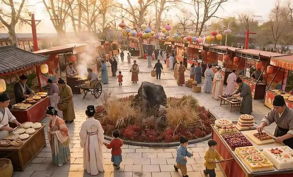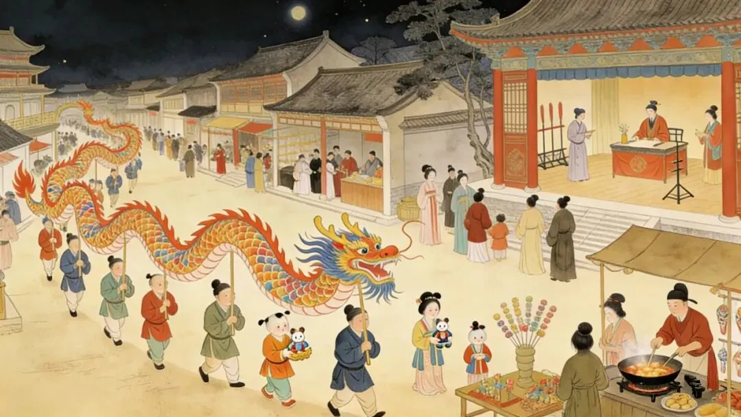 街道两旁灯火之盛,车马喧阗、乐舞彻夜。宋代的春节直至三更,街市依然人声鼎沸,炊烟袅袅——那是卖焦锤子、澄沙团子的食摊正通宵迎客。此情此景,恰似《东京梦华录》中“马行街,灯火浩闹,彻夜不绝”的生动注脚。