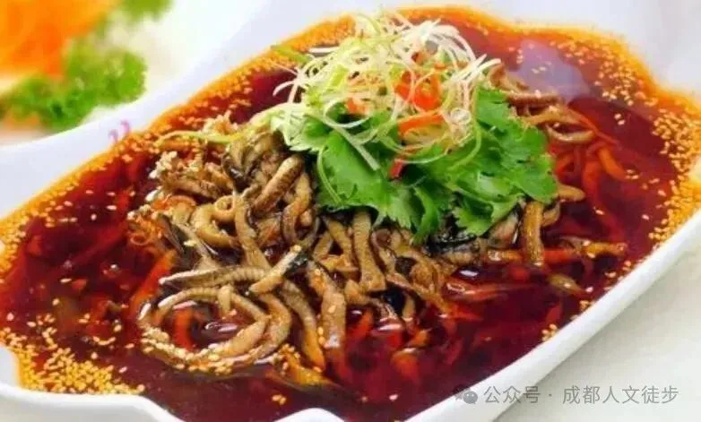 6、峨眉鳝丝:鳝鱼肉嫩味鲜,营养价值高,是峨眉山的一道特色菜。