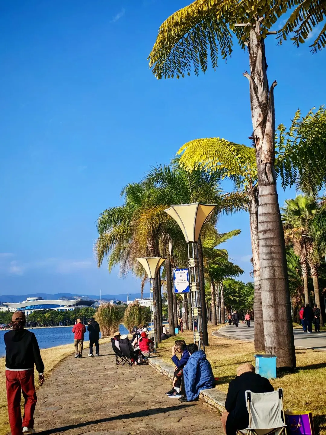 湖水很清澈,湖边三三两两的人们有的在散步、有的在悠闲的坐在湖边,什么也不做,静静地看着湖面晒着太阳,这些都是来这里旅居的人们,真的很羡慕他们的生活。当然,来旅居的应该都是退休的老人,他们辛苦了一辈子,是该享受美好生活了。