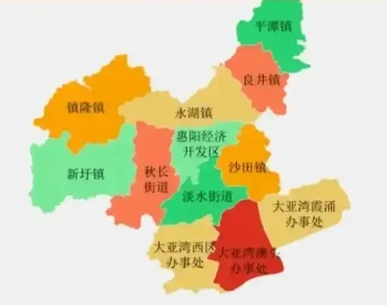 惠阳区下辖6个镇、6个街道:淡水街道、秋长街道、三和街道、澳头街道、霞涌街道、西区街道、新圩镇、镇隆镇、沙田镇、永湖镇、良井镇、平潭镇。其中,澳头街道、西区街道、霞涌街道3个街道实际由惠州大亚湾经济技术开发区代管,但未改变行政隶属关系。区政府驻淡水街道金惠大道。