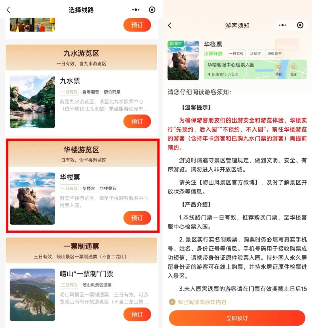 2.选择华楼游览区,阅读购票须知后即可预约;