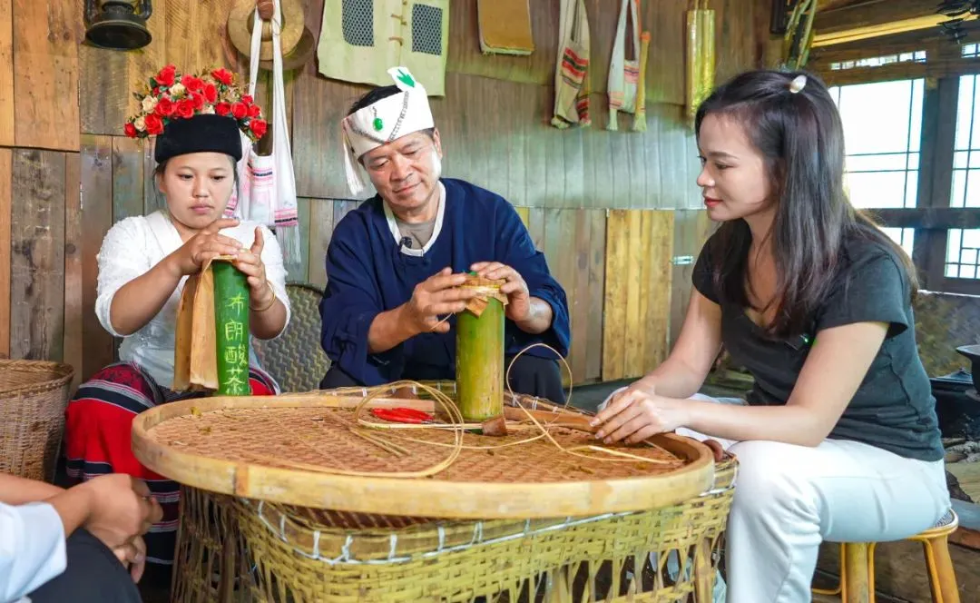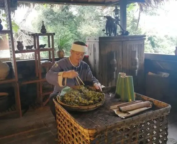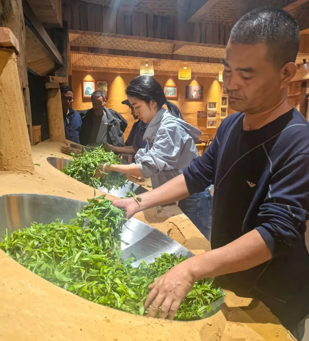 △在景迈山传统手工制茶技艺市级传承人南康的指导下学习酸茶制作(图源:普洱融媒)