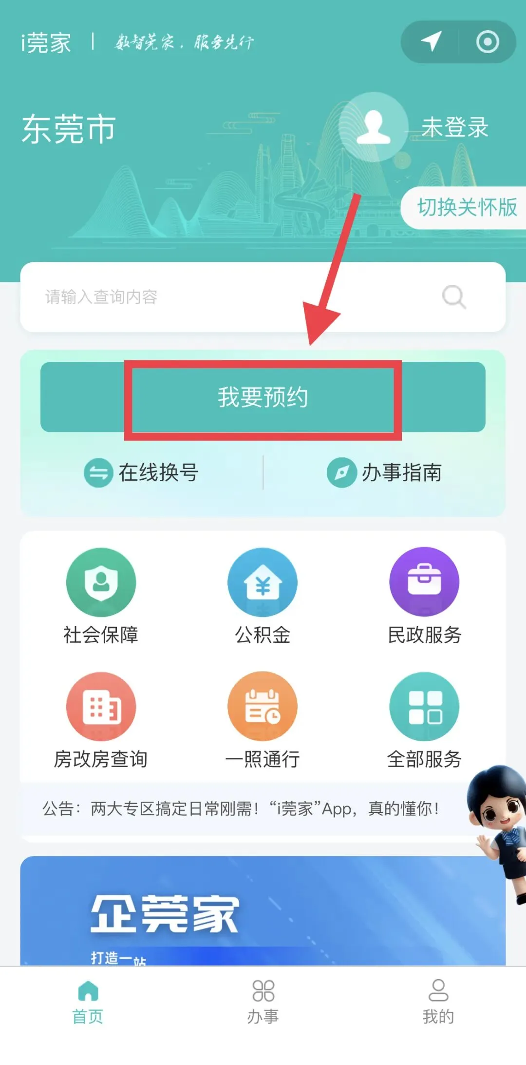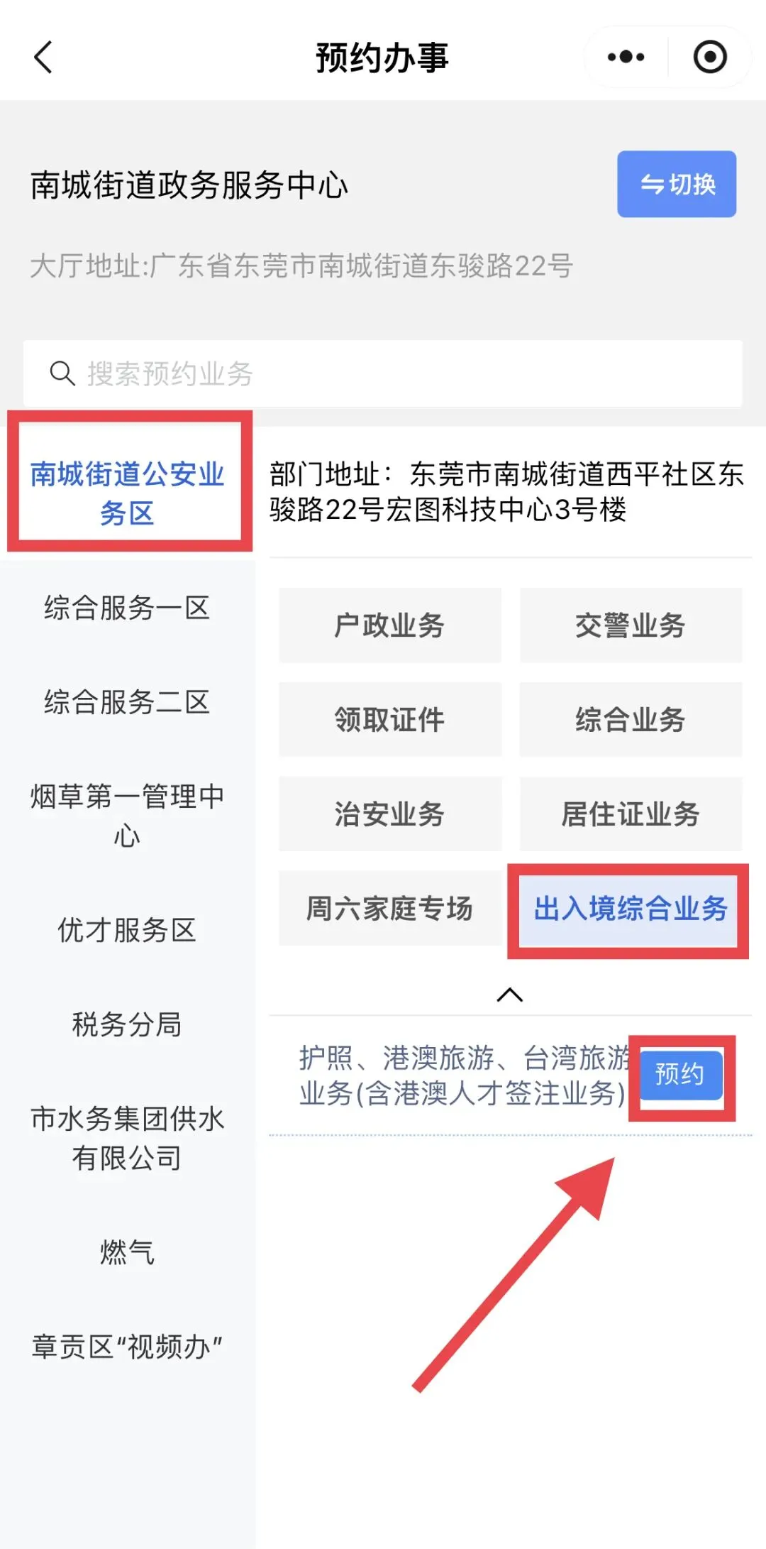 第一步:进入i莞家小程序后登录,点击“我要预约”;在办事大厅列表中选择办事大厅,举例:选择南城街道 政务服务中心;