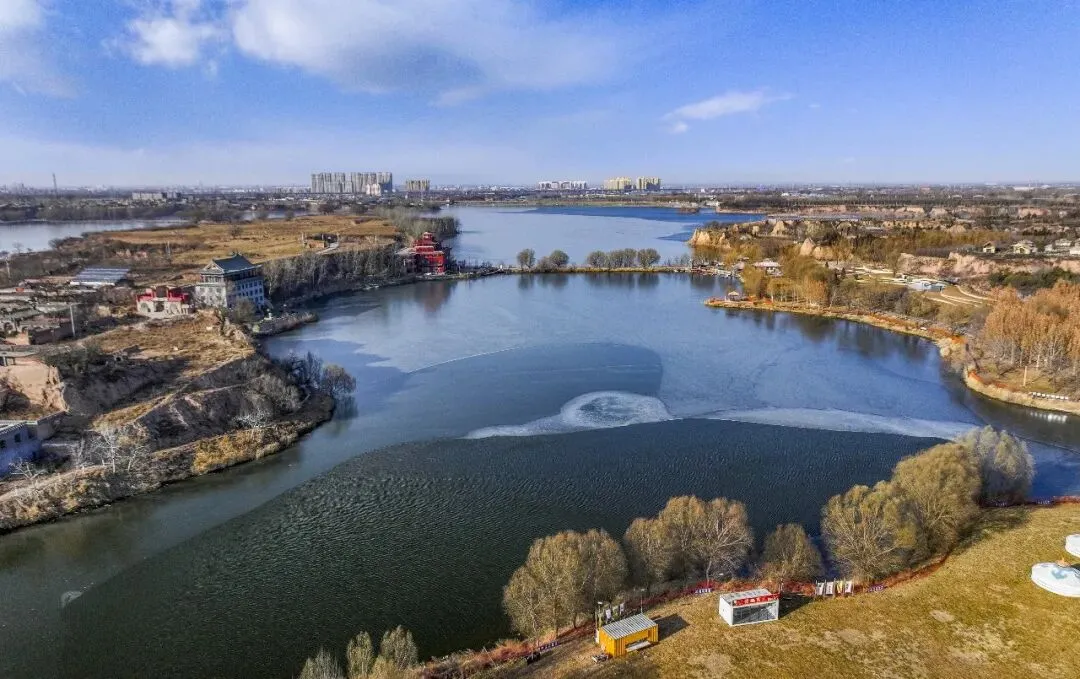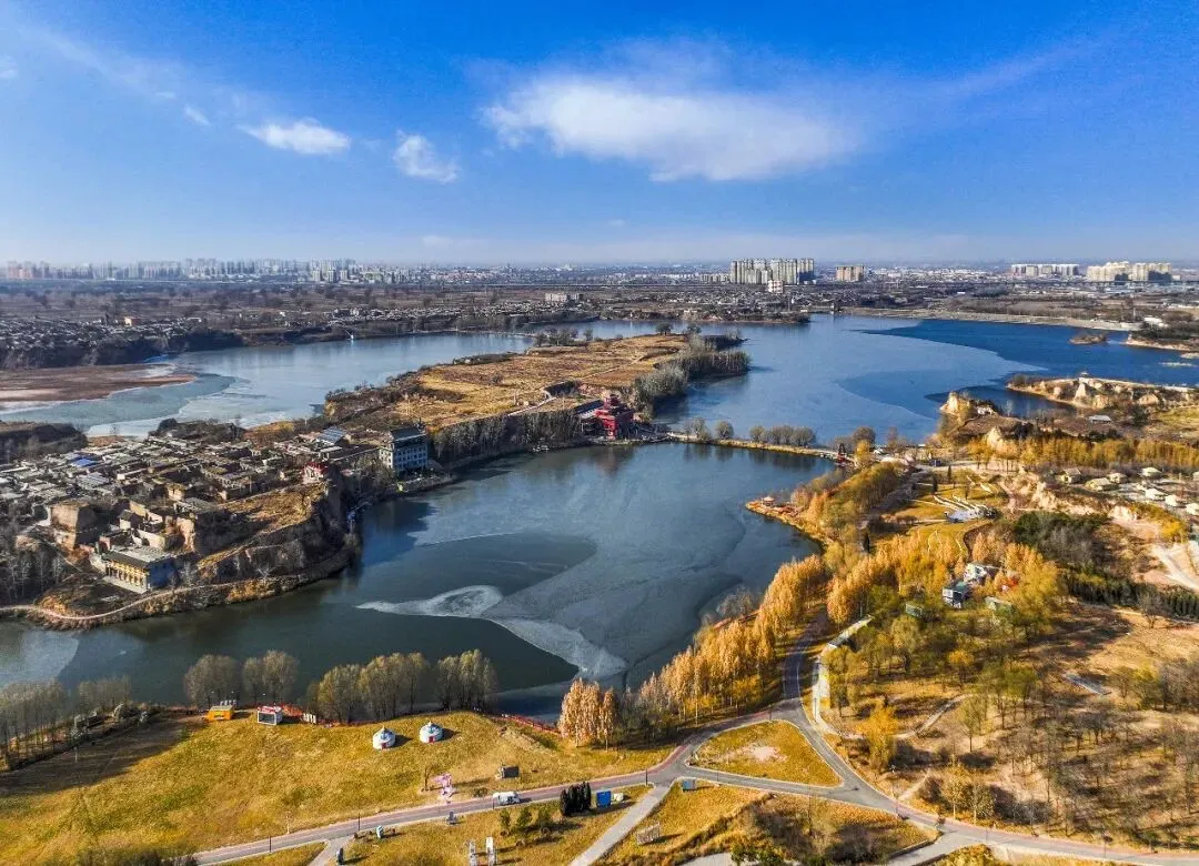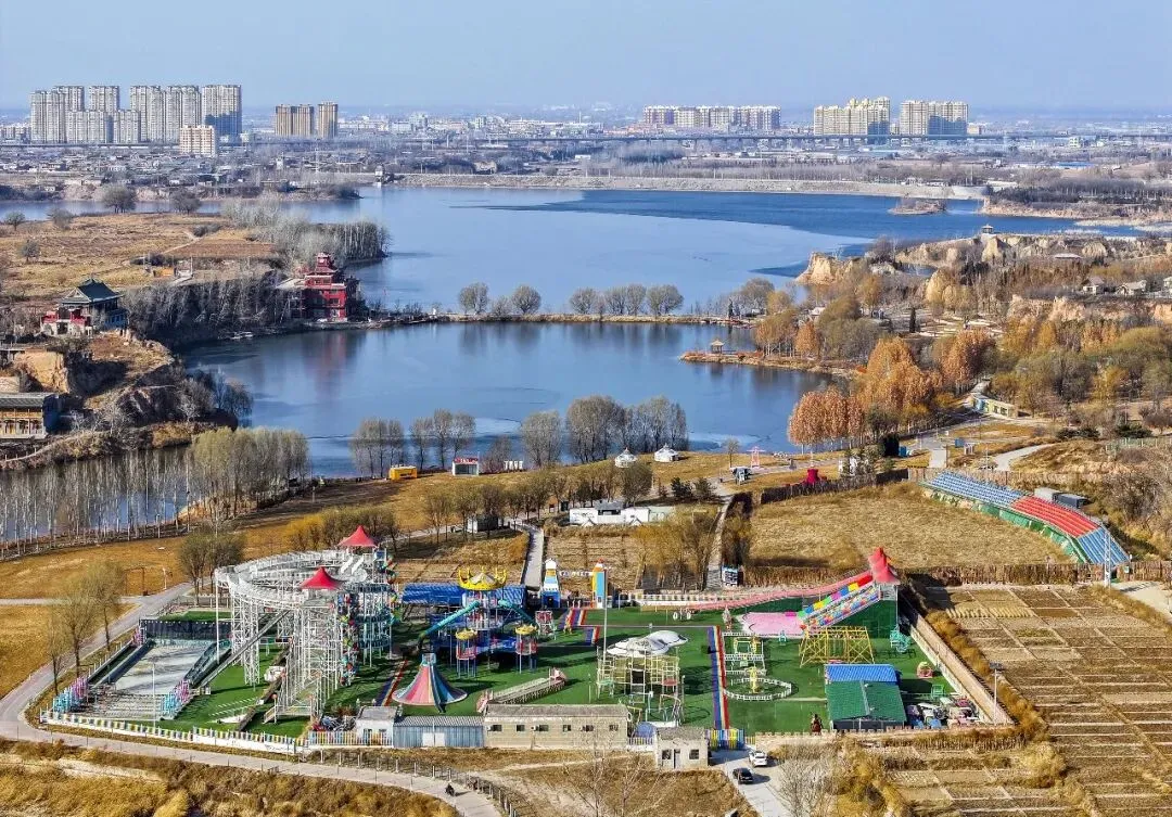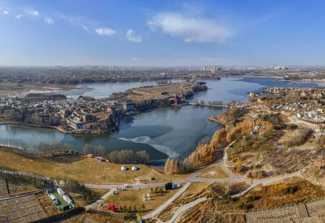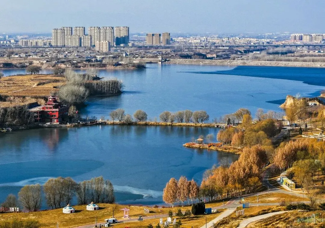 2026年1月7日,平遥县平遥源景区,河湖半结薄冰,泛黄草木间点缀着金黄的林木,古村落与现代游乐设施相映成趣,勾勒出一幅冬日生态画卷。