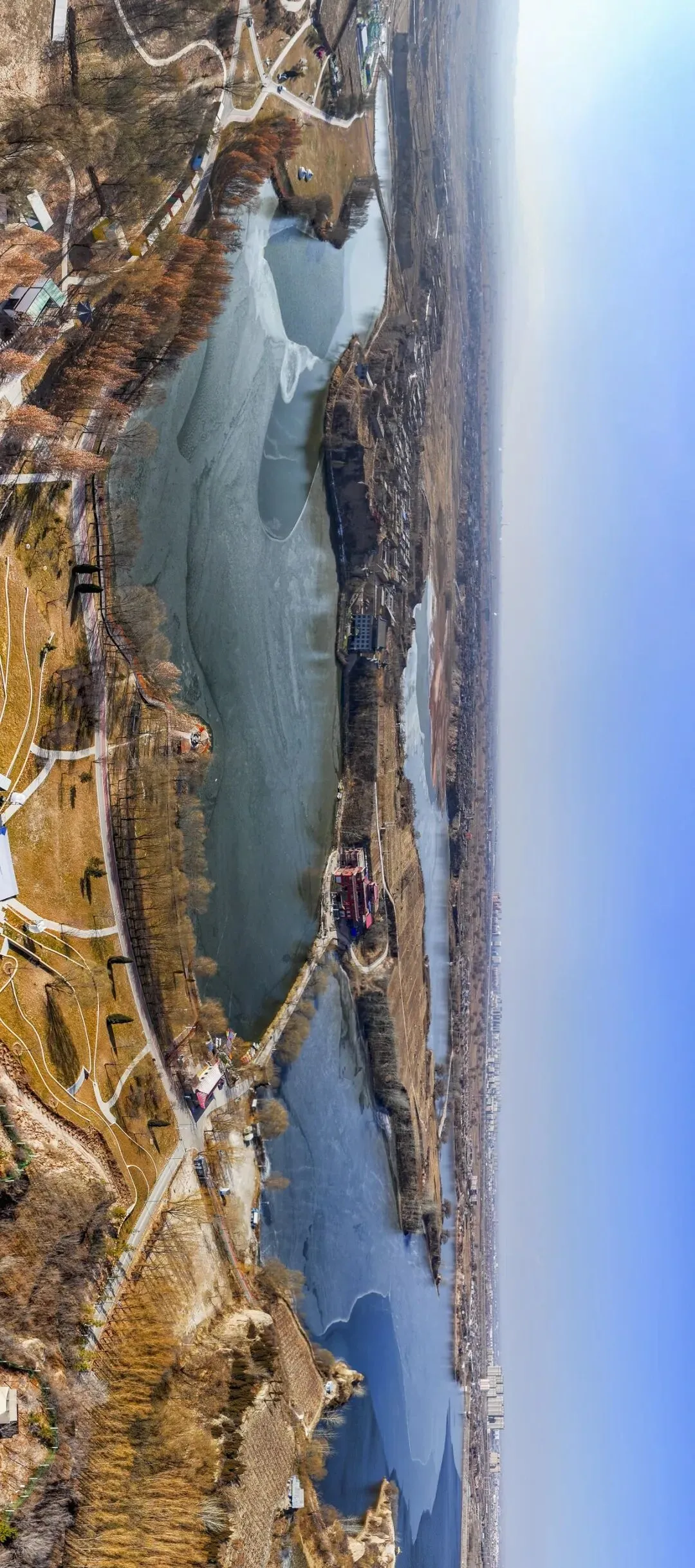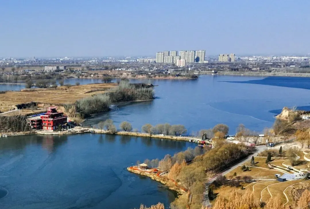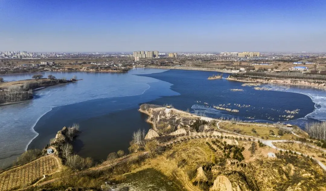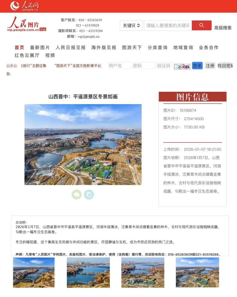 2026年1月7日,平遥县平遥源景区,河湖半结薄冰,泛黄草木间点缀着金黄的林木,古村落与现代游乐设施相映成趣,勾勒出一幅冬日生态画卷。
