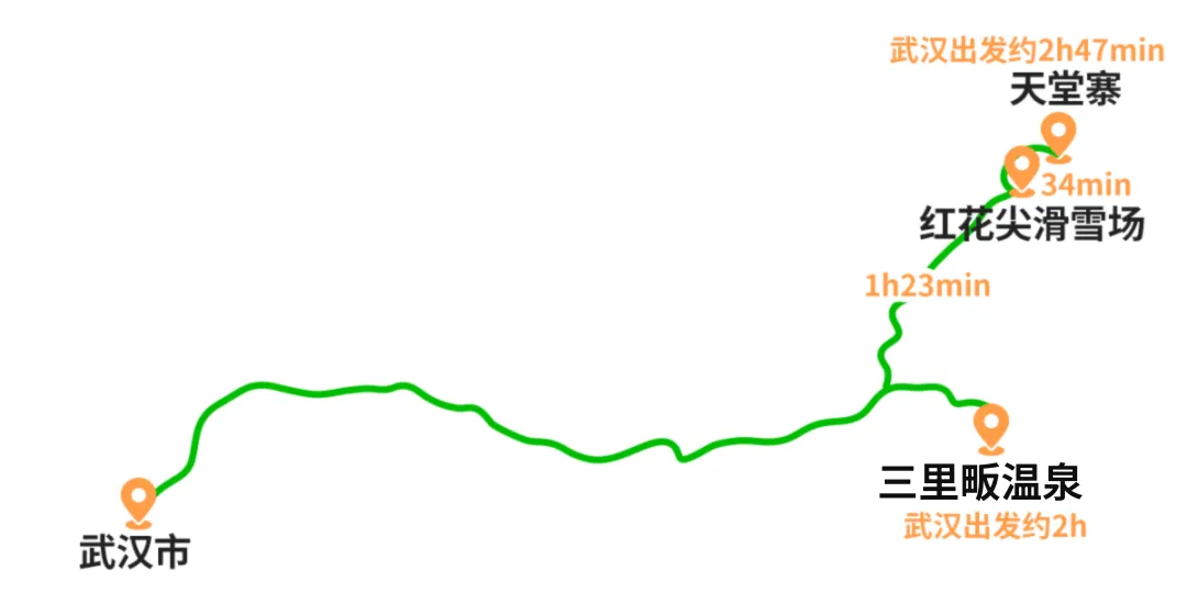 武汉市→湖北天堂寨→鸠兹古邑→红花尖滑雪场→三里畈温泉