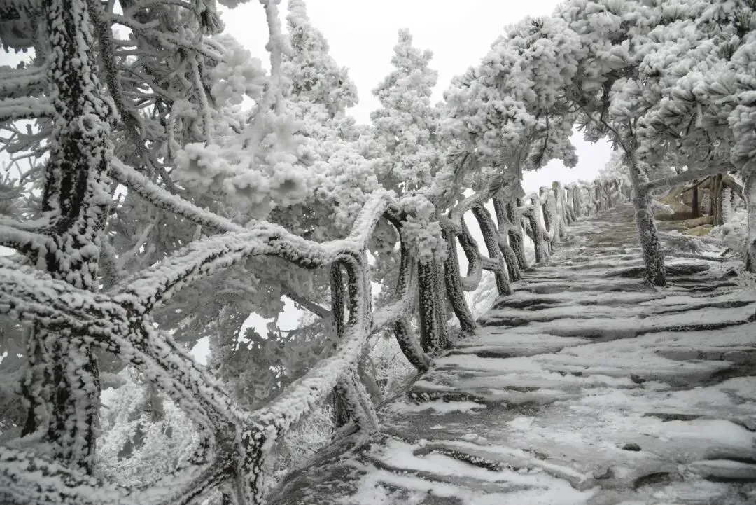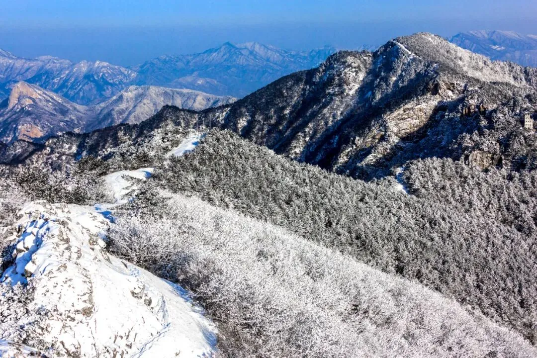 雪后的湖北天堂寨银装素裹,玉树琼枝,漫山遍野的雾淞、雪淞、雾草、雾石、冰挂、宛如一个冰雪世界,晶莹剔透。