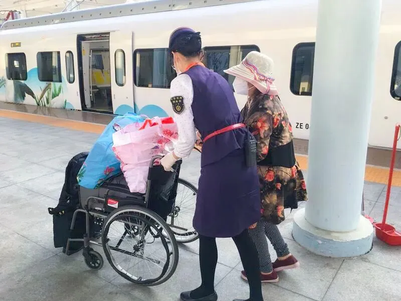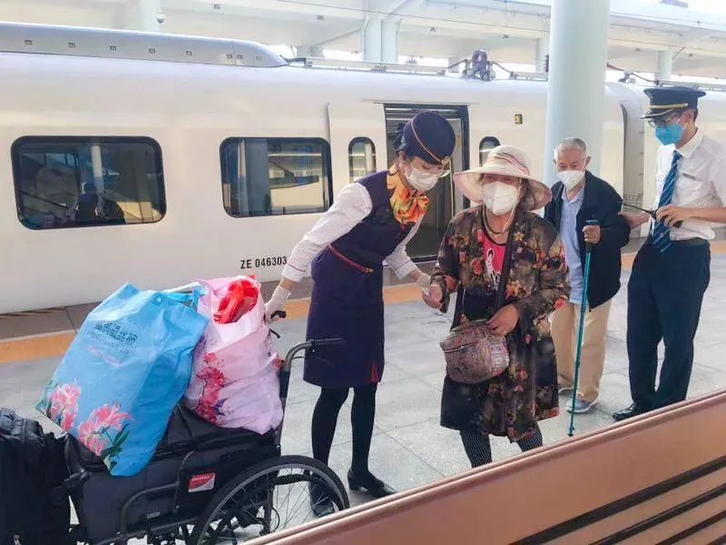 环岛高铁的列车长在巡视车厢时发现两位老人年纪较大,且有一位需要驻拐杖才能行动,还携带有5件大行李和一张轮椅。于是他联系了中转换乘车站和S8016次列车长吕明泉,全程做好特殊重点旅客帮扶工作。