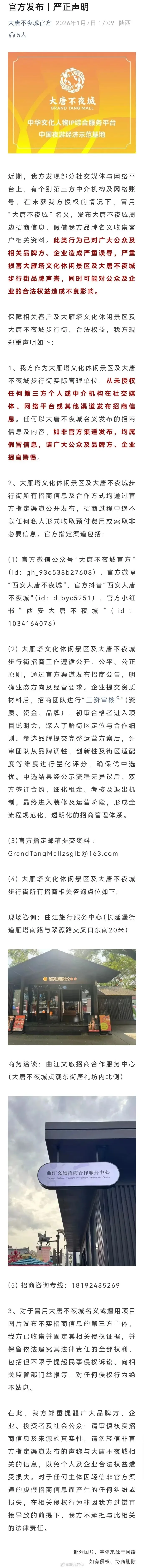 1月7日,西安大唐不夜城官方发布严正声明:近期,我方发现部分社交媒体与网络平台上,有个别第三方中介机构及网络账号,在未获我方授权的情况下,冒用 “大唐不夜城” 名义,发布大唐不夜城周边招商信息,假借我方品牌名义收集客户相关资料。此类行为已对广大公众及相关品牌方、企业造成严重误导,严重损害大雁塔文化休闲景区及大唐不夜城步行街品牌声誉,同时可能对公众及企业的合法权益造成不良影响。