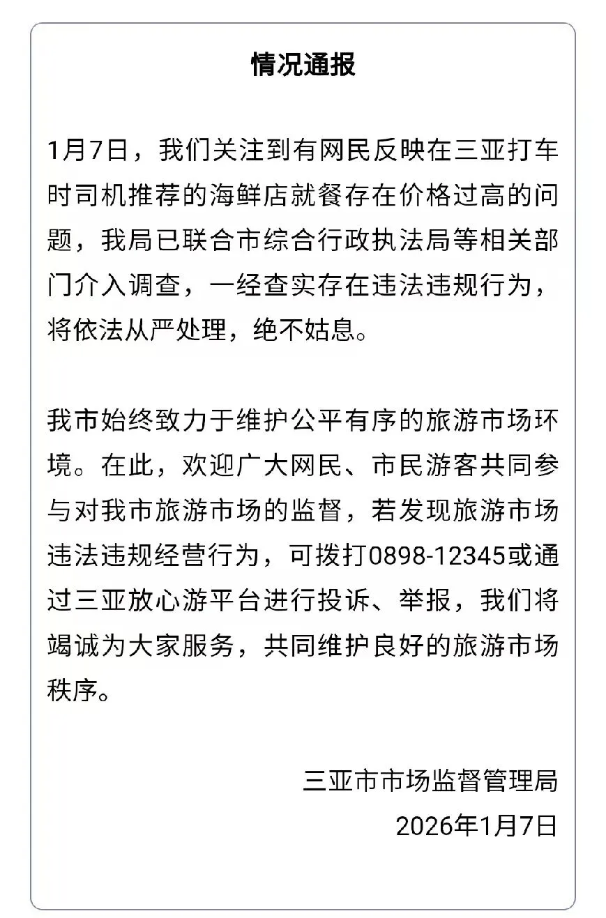 近日,有网友发帖称,与家人在三亚旅游时,被非运营车辆拉到海鲜店吃饭,4道海鲜与2个椰子共消费1930元。点菜时,服务员强调“整个三亚都是这个价格,没钱就不要来吃海鲜”。昨日,三亚市市场监督管理局发布情况通报:1月7日,我们关注到有网民反映在三亚打车前往司机推荐的海鲜店就餐时存在价格过高的问题,我局已联合交通等相关部门介入调查,如查实存在违法违规行为,将依法从严处理,绝不姑息。