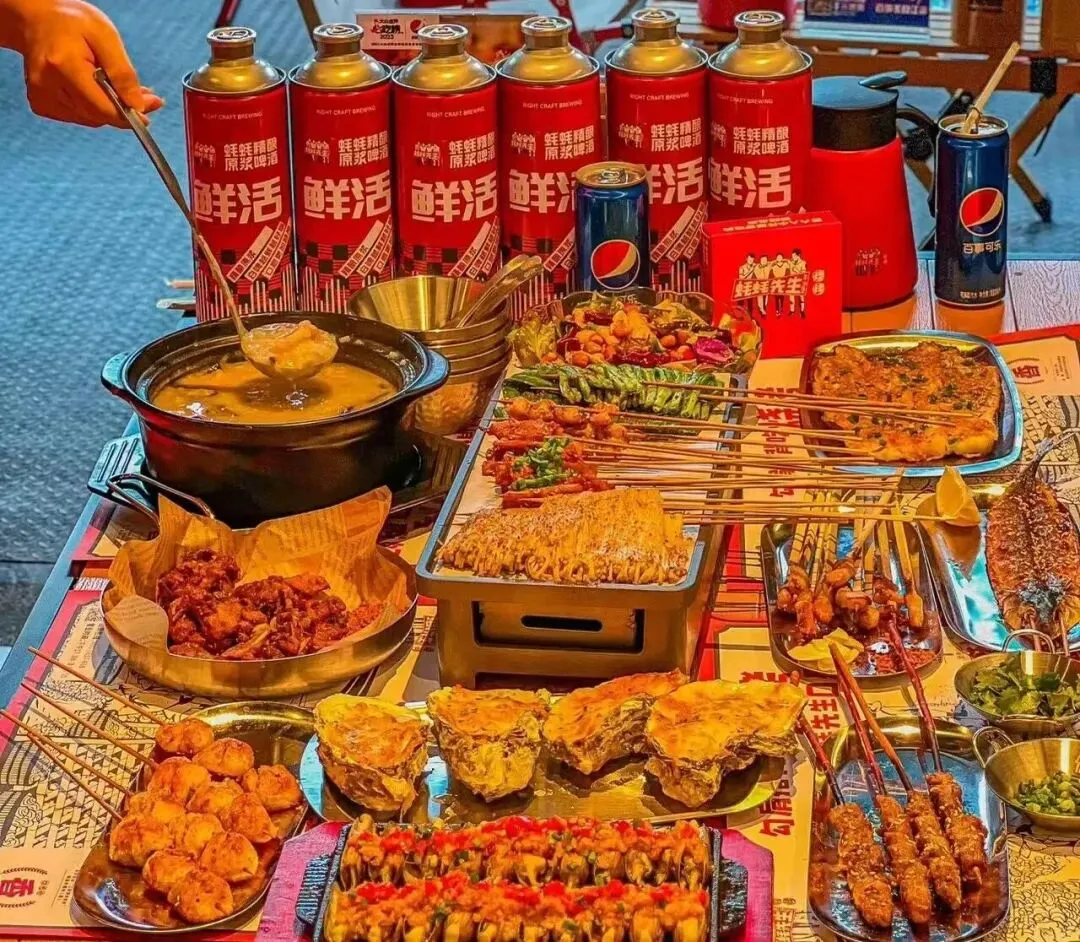 福田水围村宵夜点多,烤串、牛杂、砂锅粥都有,夜里十一点还热闹。