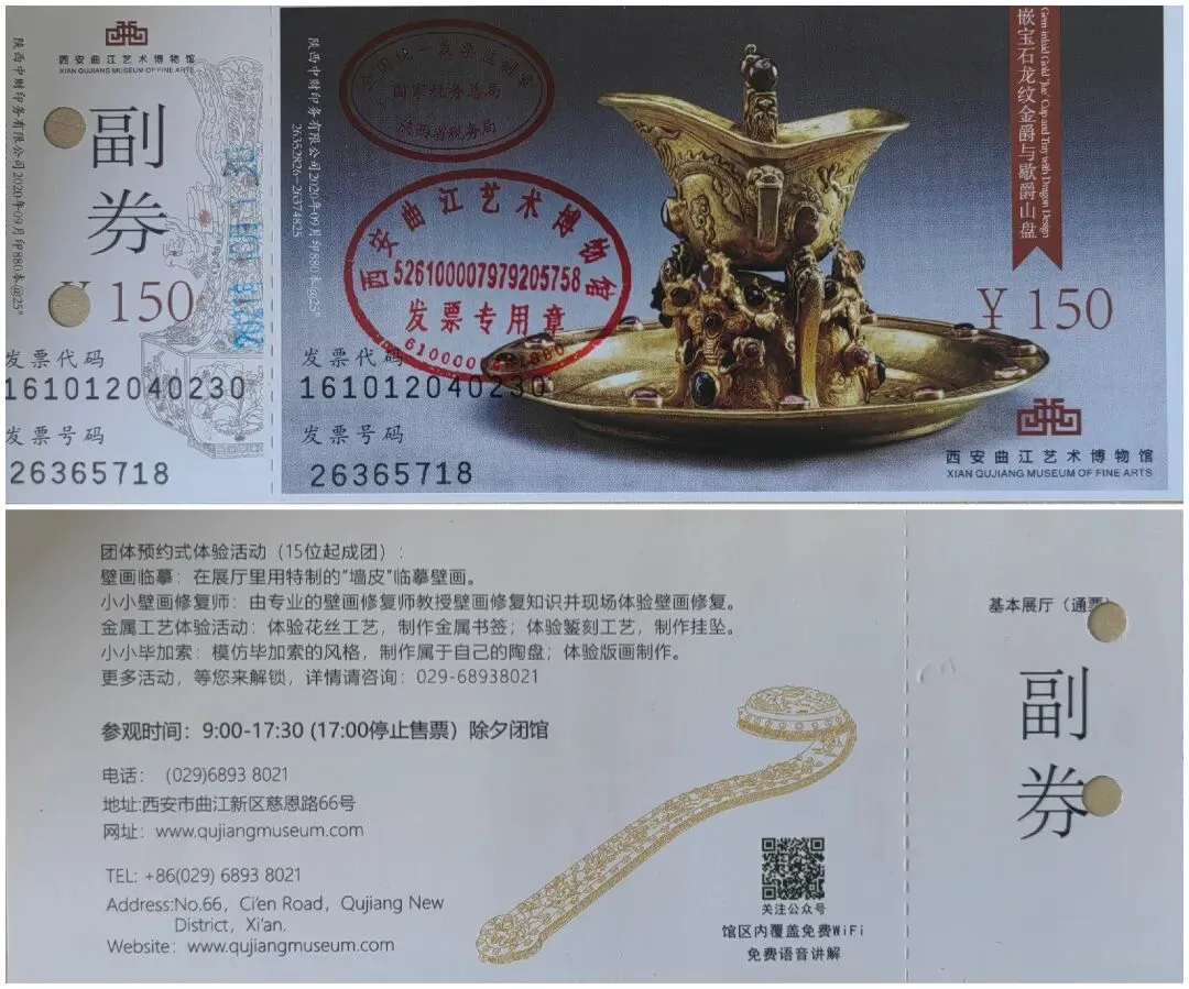 大雁塔登塔票最新25元版和20元版 二、曲江艺术博物馆 曲艺博搭档威斯汀酒店,住店客人可以免费参观,平时常规展览门票30,不定期有特展票价不等。常规展览主要是海外回流文物精品“金玉满堂”;特展的内容各异,有些水平奇高。如果算上壁画收藏,这家博物馆在卷上天的西安博物馆群里,综合实力至少能排在中上。因为特展繁多,所以他家的票也很多,想收集齐不太容易。