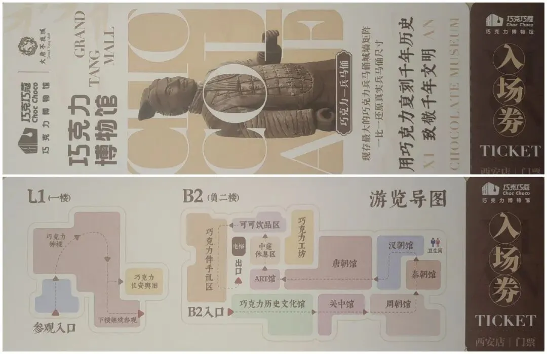 西安美术馆2024年龙主题特展异型门票 四、巧克巧蔻.巧克力博物馆 一共三层。趣味性很强,把西安的特色地标全部做成巧克力,钟楼和兵马俑的大型复刻很逼真。因为馆内全部展品都是巧克力,加起来至少有上百吨,所以馆内的巧克力香味非常浓郁,可能是怕游客不小心吃掉展品,买票进门就发巧克力,可以边吃边看。另外,我至少在青岛和上海都见过这家博物馆。各展馆的门票是同系列联动套票,西安的这张上有“大唐不夜城”的字样。