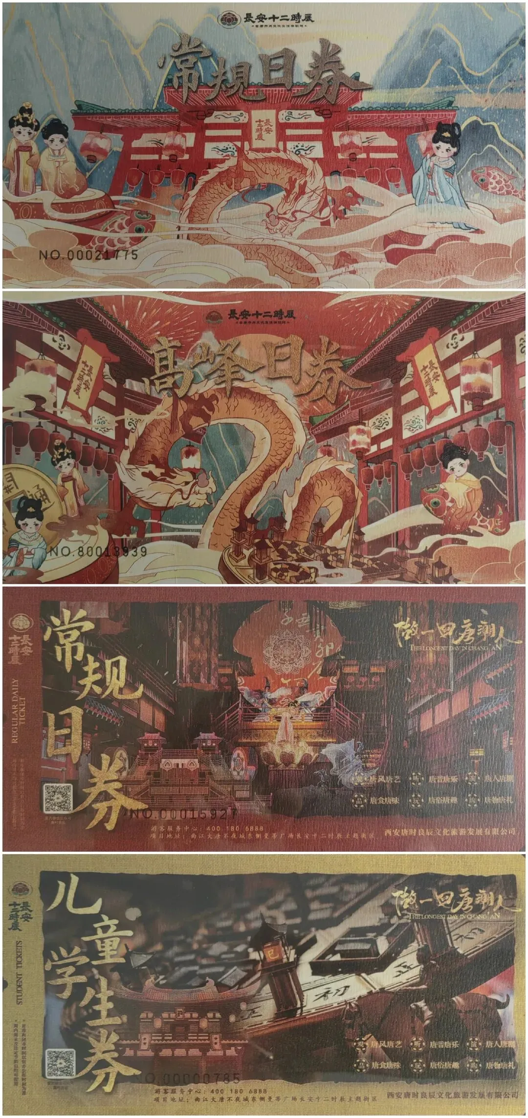 西安音乐厅演出门票 六、长安十二时辰 位于雁南一路。音乐厅是雅,十二时辰却把市井玩到极致。这里以唐代市井文化为核心,通过建筑、服饰、语言、钱币等形式,再现盛唐时期的长安城风貌,演员与游客轮番互动,既可以品尝唐风小吃,也能参与剧情丰富的剧本杀,一秒穿越。十二时辰目前在不夜城正装修二期,看样子不久又会有新的项目。同样,这里的门票做的也如其风,主打一个炫目,我收集了四种。