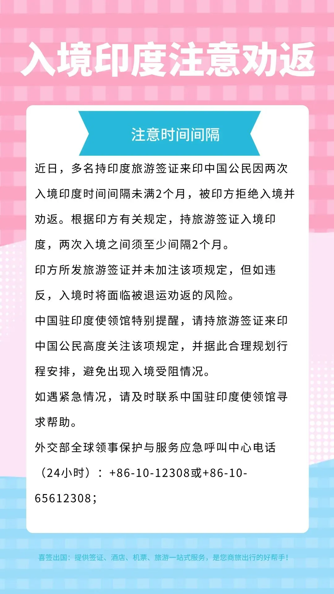 近日,多名持印度旅游签证来印中国公民因两次入境印度时间间隔未满2个月,被印方拒绝入境并劝返。根据印方有关规定,持旅游签证入境印度,两次入境之间须至少间隔2个月。