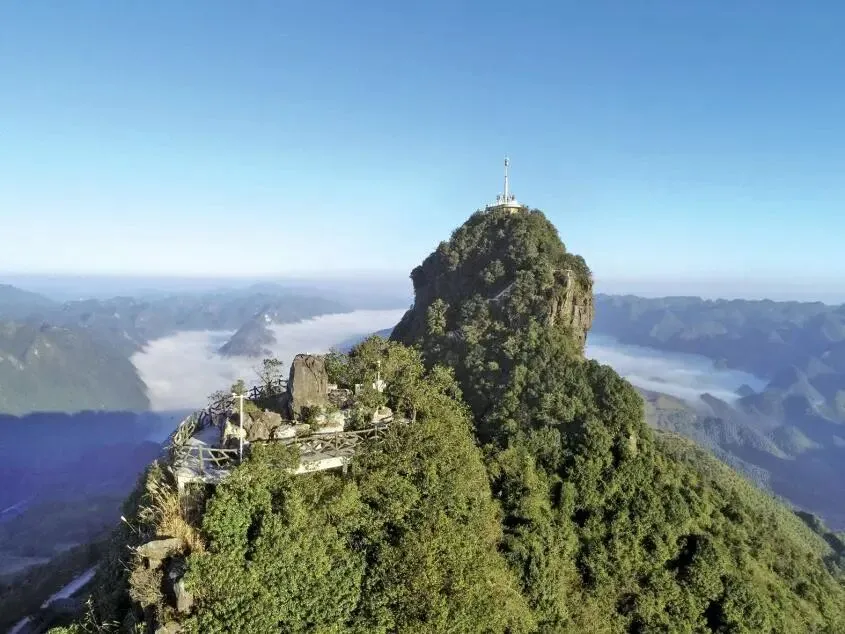 拔地擎天,冠冕南疆,一柱翠苍。瞰云涛涌雪,金乌浴浪;石峰横戟,玉女凌霜。蓬岛移根,娲皇遗魄,谪向红尘证莽苍。空濛处,看松针悬露,苔石浮光。