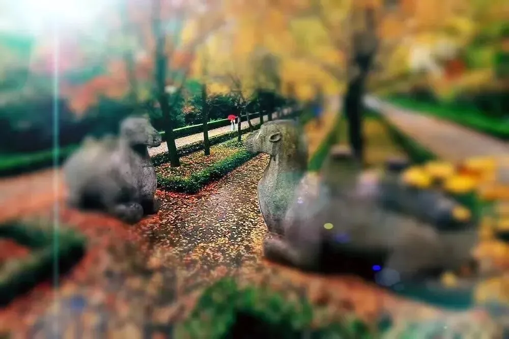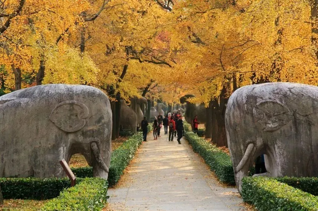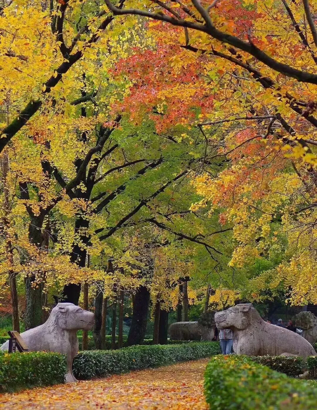 现在是明孝陵最美的时候,600米的神道被金黄的 银杏叶铺满,饱经风霜的石兽或蹲或立,姿态交替,配以苍山远树,形成一派严肃静穆的气氛,仿佛将风云变幻回600多年前的明代。