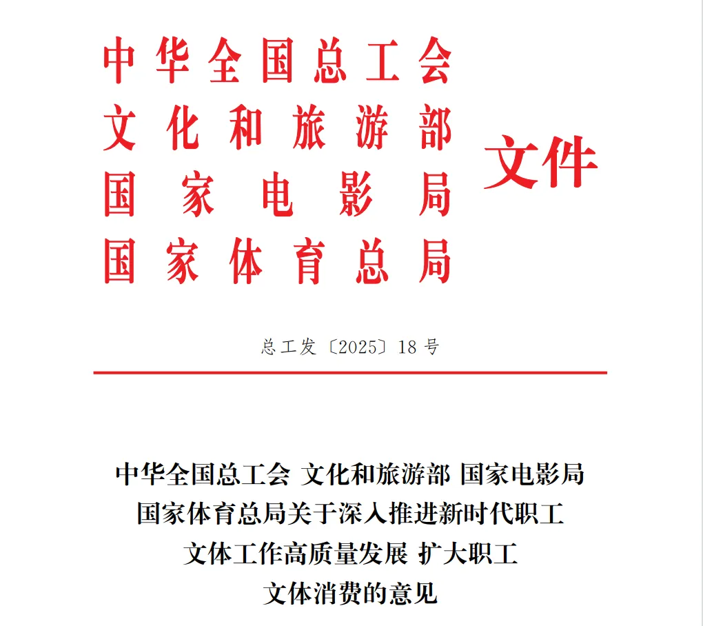 近日,中华全国总工会、文化和旅游部、国家电影局、国家体育总局联合印发了《关于深入推进新时代职工文体工作高质量发展 扩大职工文体消费的意见》(以下简称《意见》),四部门协同发力,深入推进新时代职工文体工作高质量发展,更好满足广大职工日益增长的精神文化需求,进一步扩大职工文体消费,释放职工消费潜力。