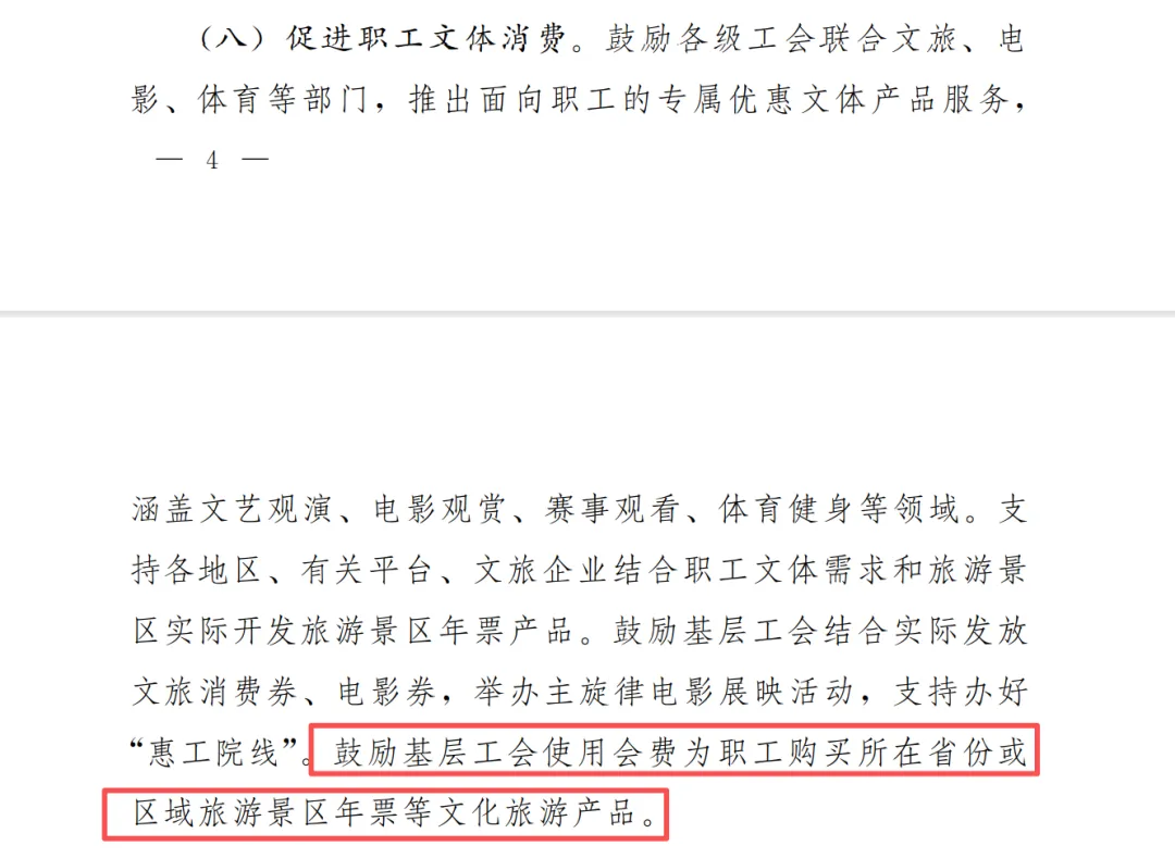 《意见》在“促进职工文体消费”重点任务中明确提出:鼓励基层工会结合实际发放文旅消费券、电影券,举办主旋律电影展映活动,支持办好惠工院线”。鼓励基层工会使用会费为职工购买所在省份或区域旅游景区年票等文化旅游产品。