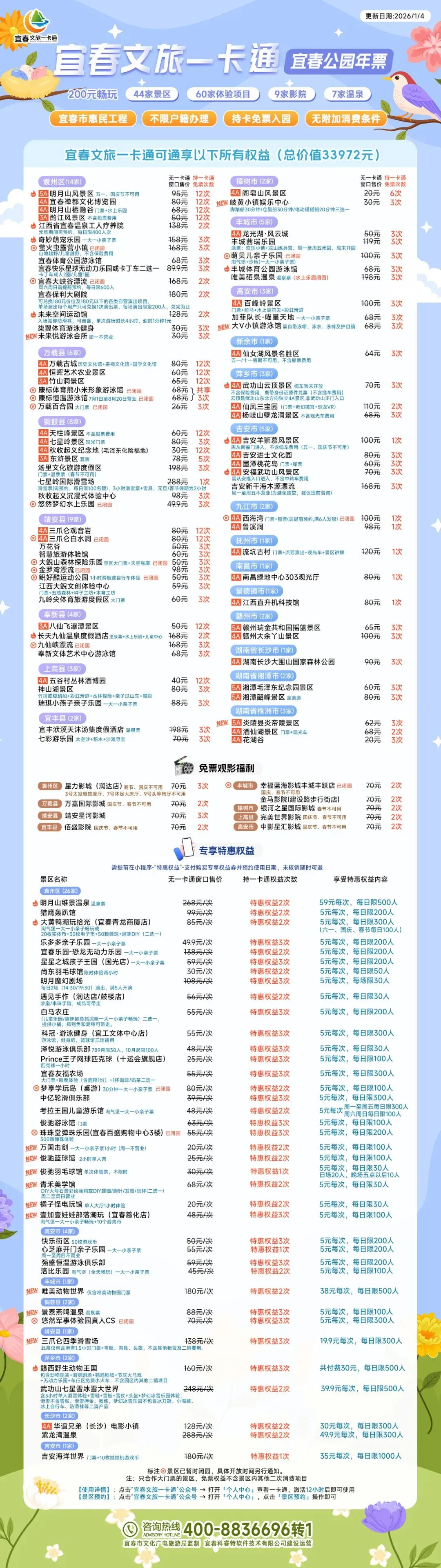 宜春文旅一卡通整合涵盖景区、温泉、影院、滑雪及各类体验项目,提供超值服务。