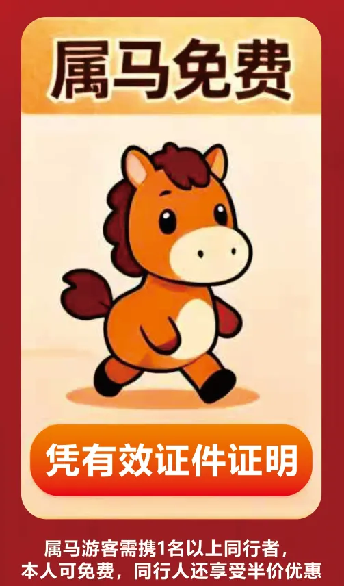 活动时间:2026 年 1 月 1 日 —12 月 31 日 优惠对象:生肖属马游客 优惠内容:全年免门票