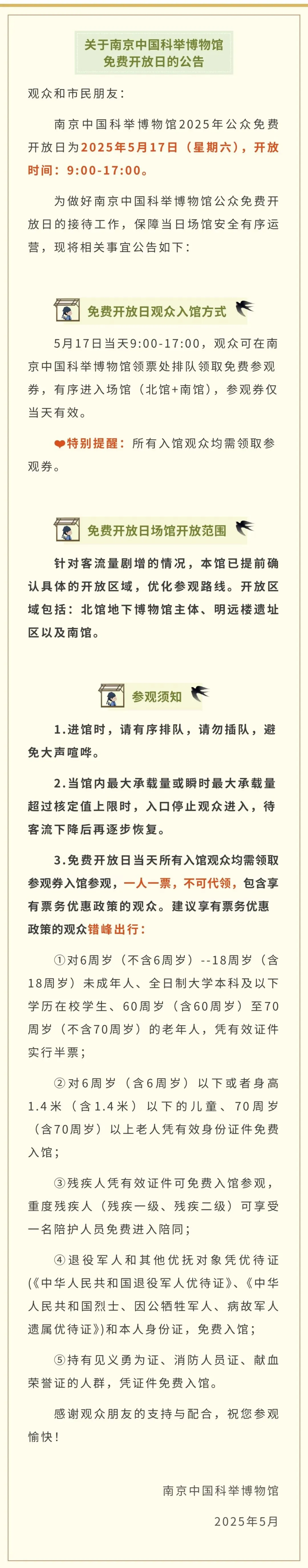 免费开放日观众入园方式:5月17日免费开放时间为09:00-17:00,游客有序排队,领取参观券后方可入园(参观券仅当天有效)。