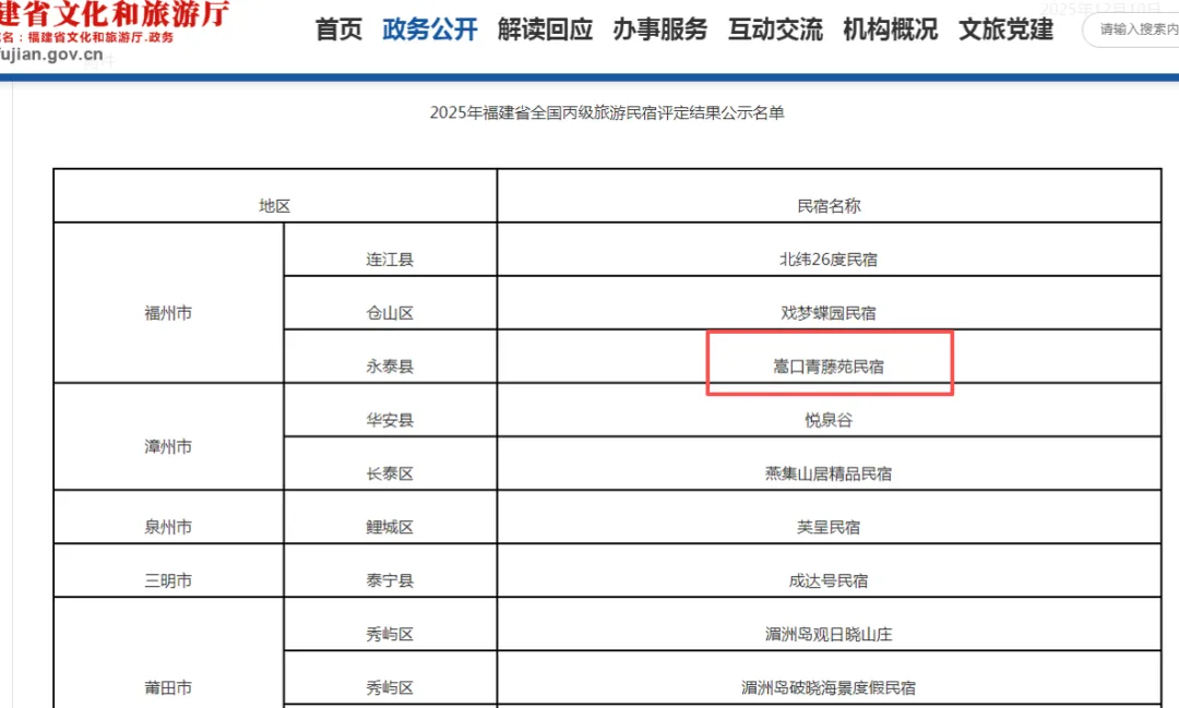 2025年福建省全国丙级旅游民宿评定结果公示