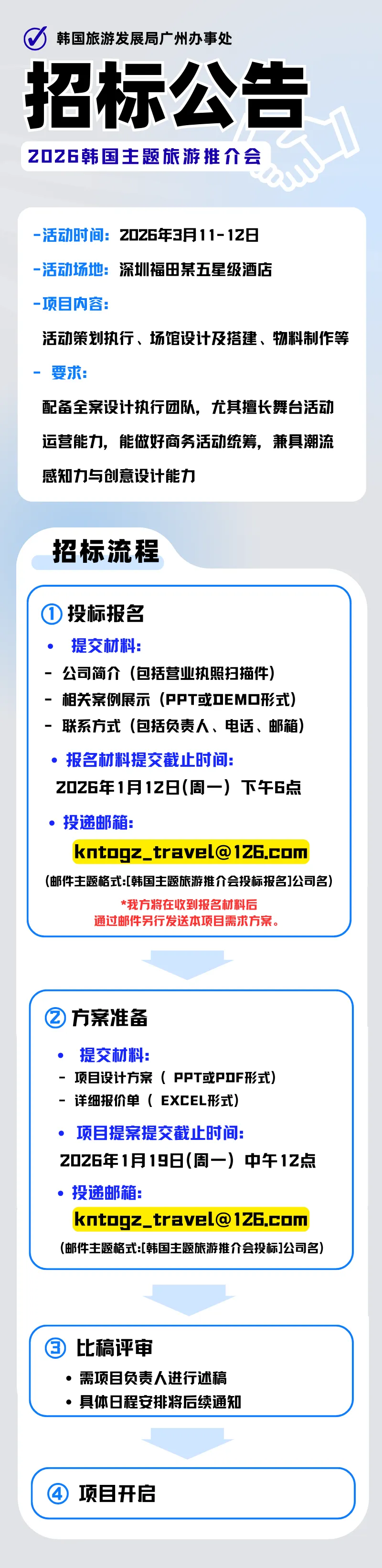 您现在的位置是:首页 > 国内旅游目的推荐 > 正文 国内旅游目的推荐 [通知] 2026年韩国主题旅游推介会招标公告 admin2026年01月08日 18:05:01国内旅游目的推荐10 [通知] 2026年韩国主题旅游推介会招标公告 转载请说明来源于"旅荐网",部分内容转载自网络,如有侵权请联系qlwl@foxmail.com删除 本文地址:https://www.15386.cn/post/79401.html 上一篇 喜报丨产业公司通达公路参建的旅游路东延项目荣获“华东地区优质工程”奖 下一篇 南京官宣!43家景区限时免费! 相关文章 广州从化 • 天适樱花悠乐园春游赏花旅行攻略|邂逅粉色浪漫:交通、花期、游玩路线与拍照打卡全指南 速看!生态城景区交通出行攻略,春节游玩全靠它! 福州免费游玩攻略|10个宝藏地,0元逛遍有福之州 昆明旅游攻略(本人亲测所有地点感受) 洛阳龙门石窟旅游攻略~ ��盐城3天2晚旅行攻略,跟着本地人玩不踩雷 内蒙古|4天3晚呼市小环线旅游攻略 【慢享受】春日游沈阳—我的私人沈阳旅游攻略(结尾有惊喜) 截图为证西安本地人写的西安旅游攻略 超省心!毕节全域旅游攻略H5来了 发表评论 取消回复 评论列表 这篇文章还没有收到评论,赶紧来抢沙发吧~