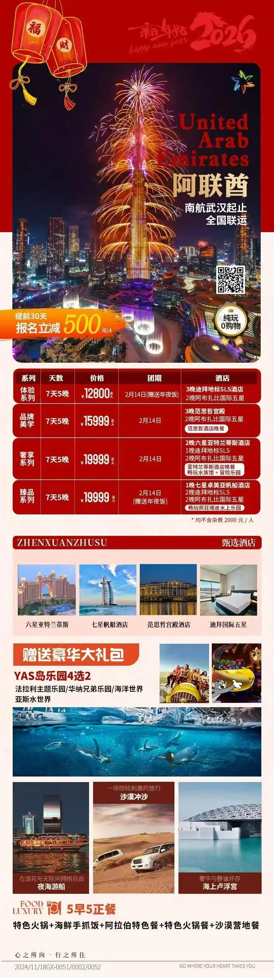 4. 阿联酋 · 迪拜 推荐理由:免签便利,现代奢华与沙漠体验结合。 亮点:哈利法塔灯光秀、沙漠冲沙、迪拜购物节(通常持续至春节)。