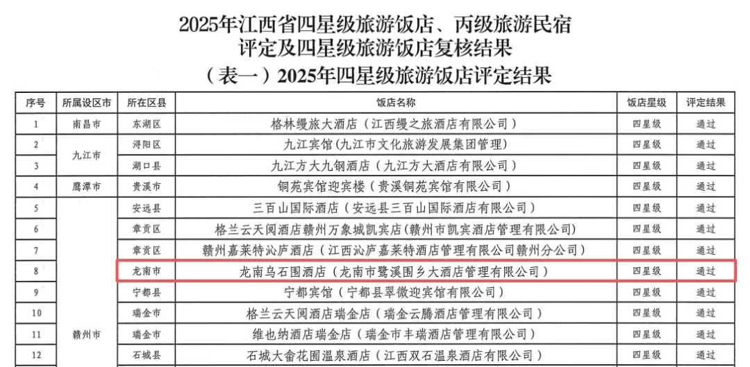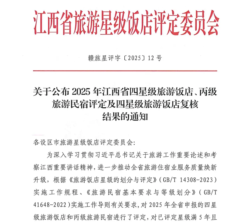 近日,江西省文化和旅游厅发布《关于公布2025年江西省四星级旅游饭店、丙级旅游民宿评定及四星级旅游饭店复核结果的通知》,我市乌石围酒店获评国家四星级旅游饭店,关西围(圳下围)民宿、关西围(田心围)民宿、茶予栖民宿获评国家丙级旅游民宿。