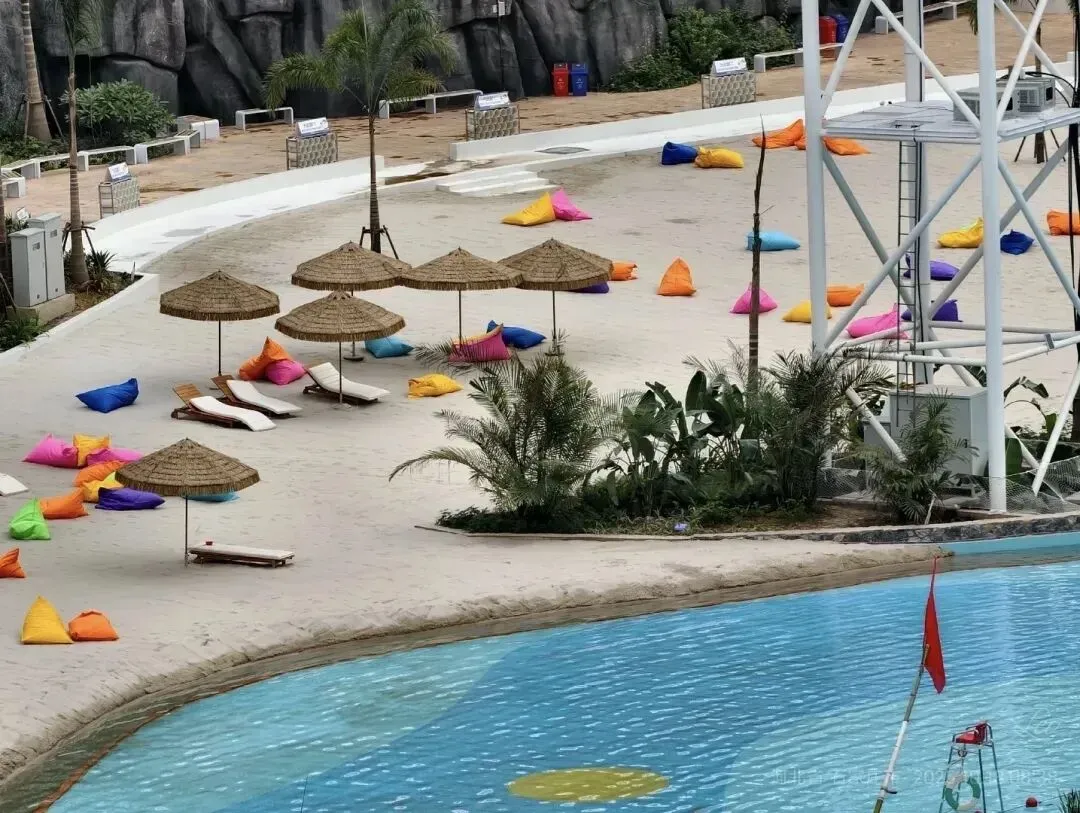 在阳光沙滩区域,大人们躺在沙滩椅上,享受着惬意时光。