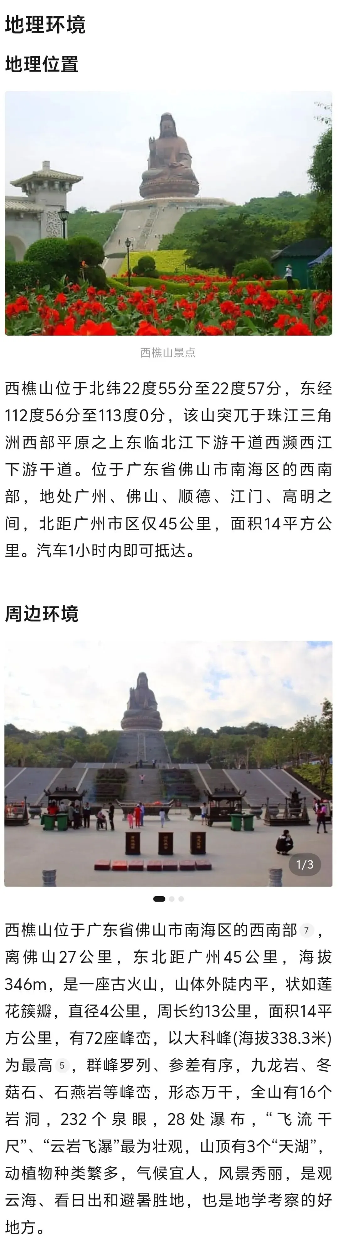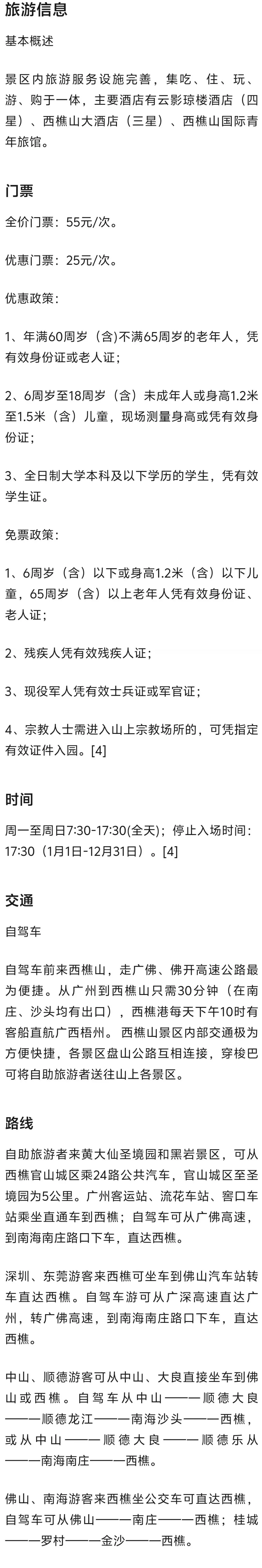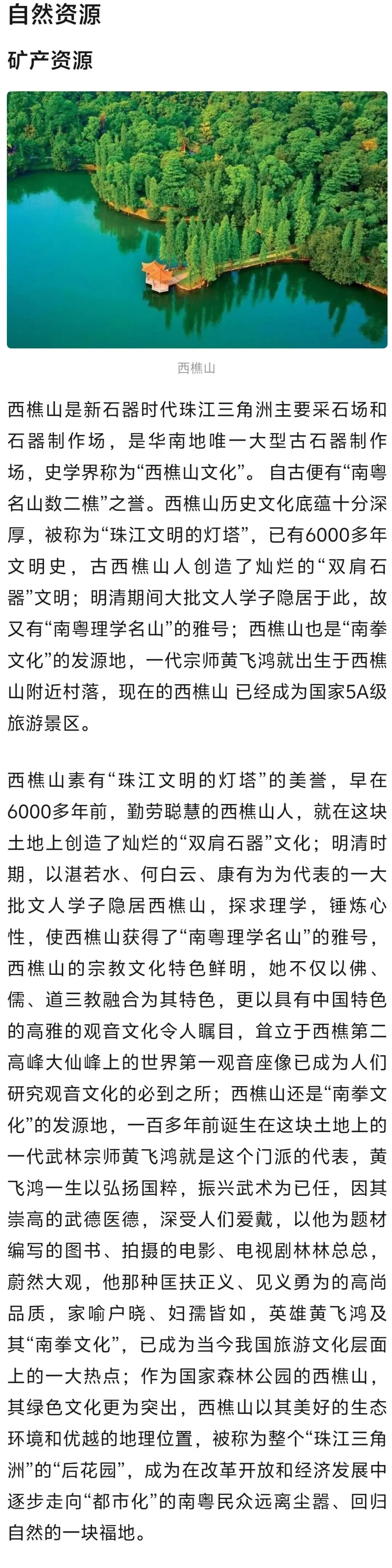西樵山中国5A级旅游景区西樵山,位于广东省佛山市南海区的西南部,直径4公里,是广东四大名山之一。截至2008年占地13.6平方公里,主峰大科峰海拔338.3米,其自然风光清幽秀丽,旅游文化底蕴厚重,民俗风情古朴自然,是源远流长的百越文化发祥地和千古文化名山,更是岭南文化的杰出代表。拥有国家AAAAA级旅游景区,中国国家森林公园等荣誉。西樵山自然风光美仑美奂,山上七十二峰峰峰皆奇,四十二洞洞洞皆幽,更有湖、瀑、泉。