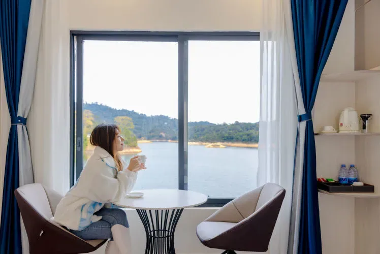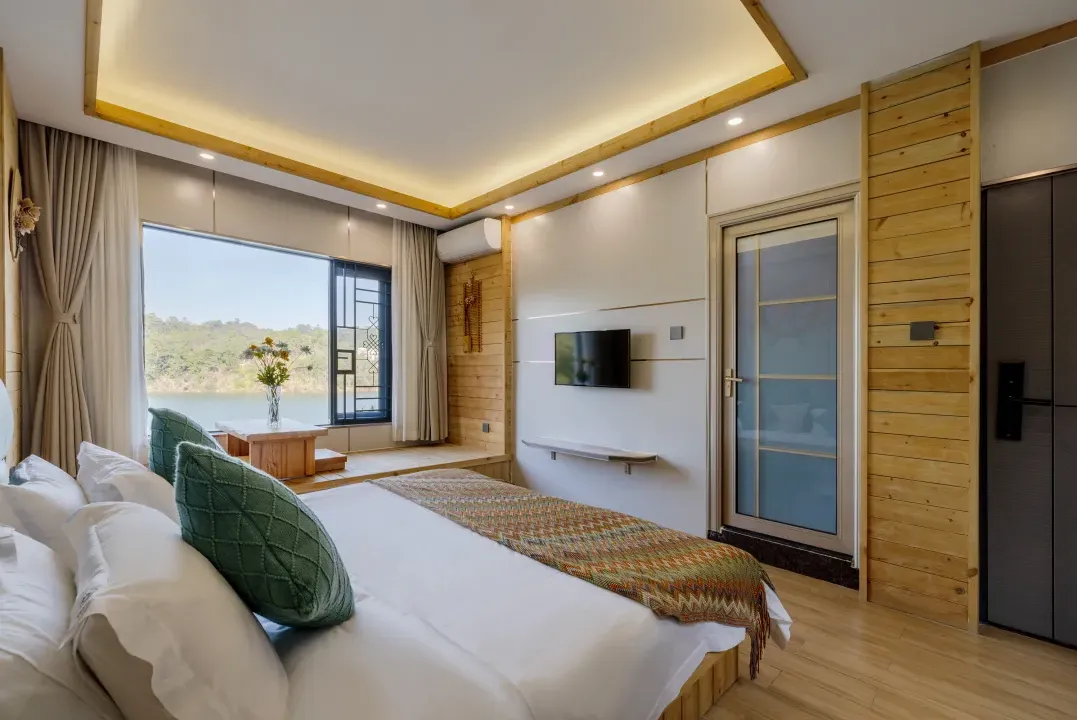 入住湖畔大床/双床房,内含独立温泉泡池