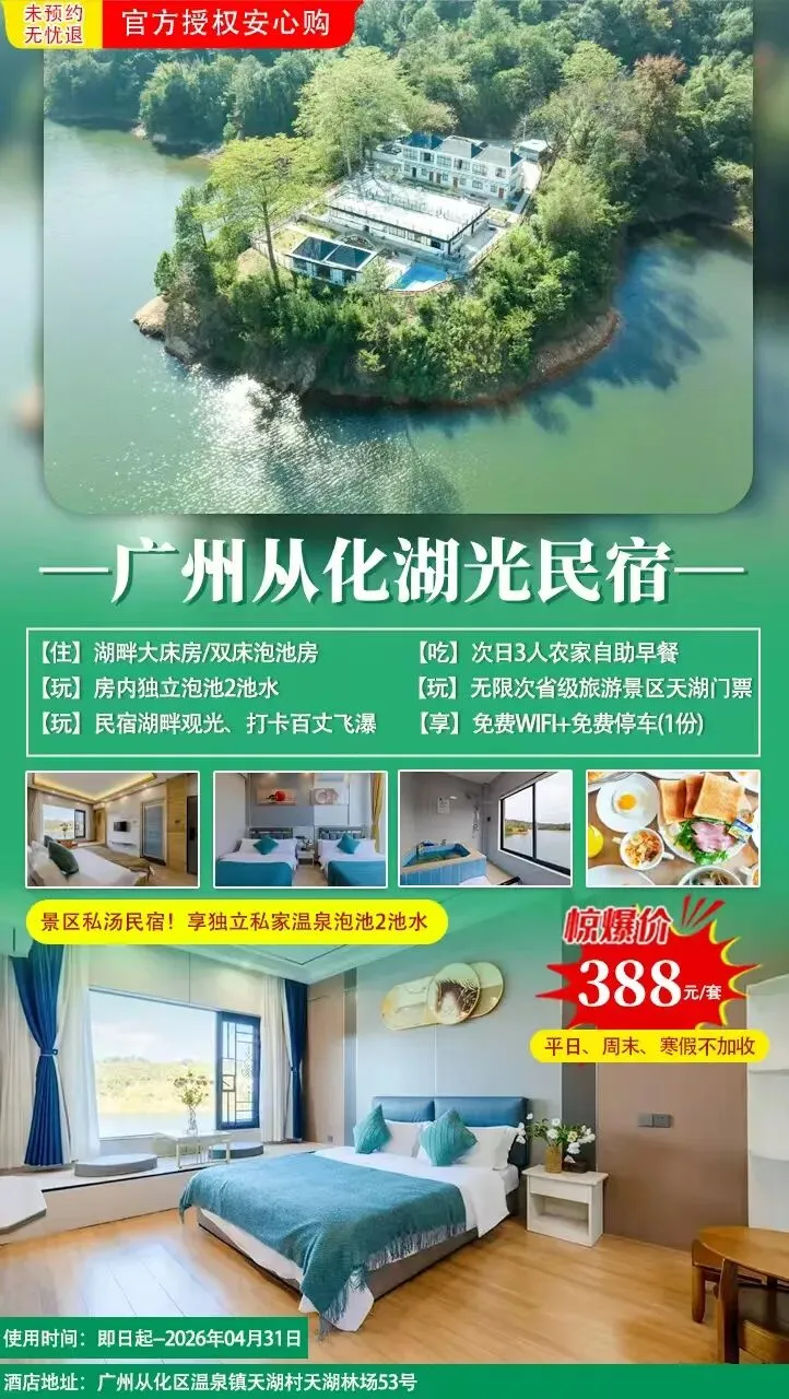 388元抢【广州从化·天湖景区内湖光民宿】湖光民宿泡池大床或双床房+次日自助早餐+私家温泉2池水+无限次天湖观光门票+环湖观光