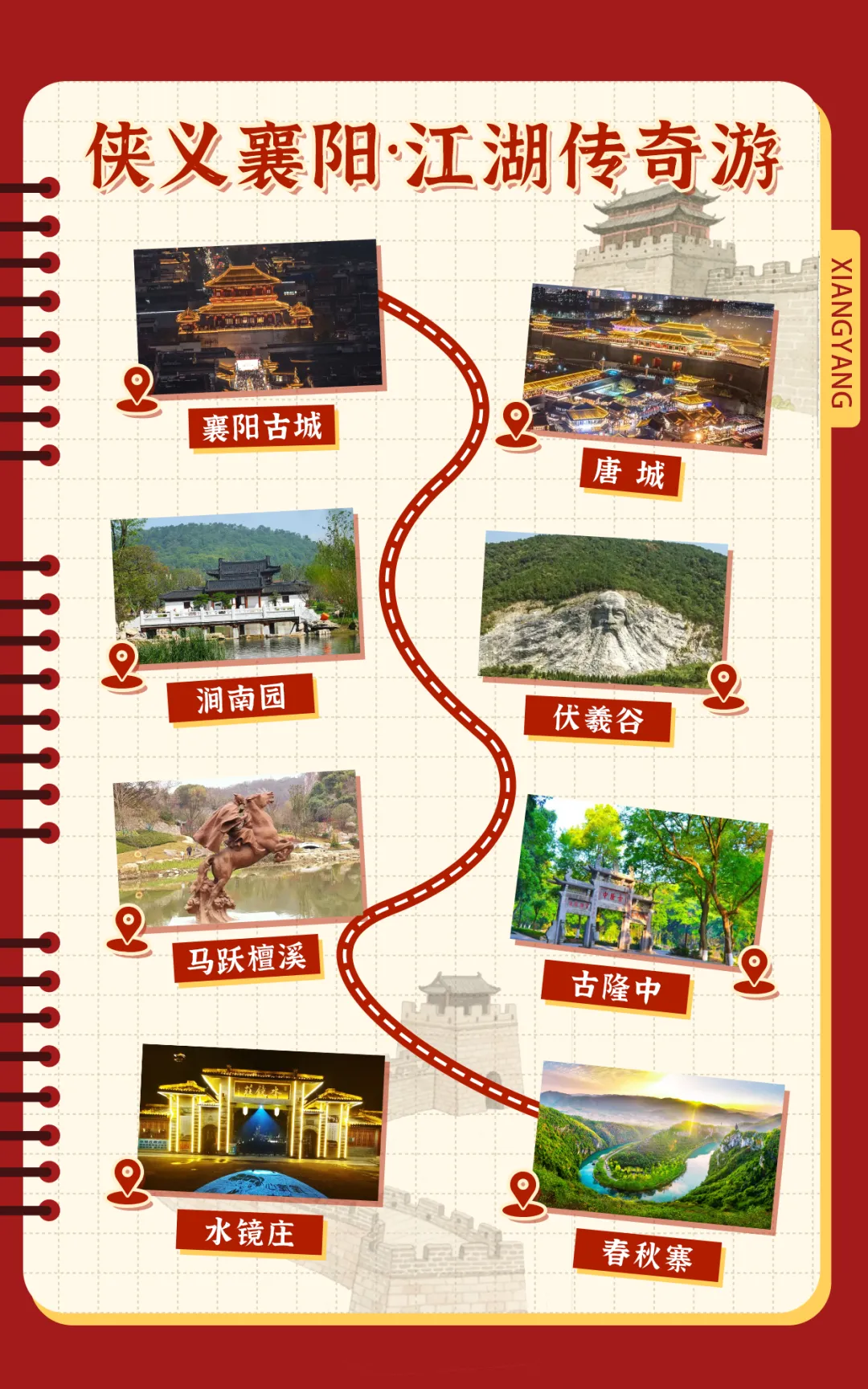 线路简介:襄阳,一座被侠义精神浸润的千年城池。登上襄阳古城墙,遥想金戈铁马;步入唐城,梦回快意江湖;在涧南园与伏羲谷,寻觅隐士高踪;在马跃檀溪回味“的卢一跃”;至古隆中与水镜庄,聆听智者心曲;终抵奇险春秋寨,俯瞰山河如画。这条线路,串联起从沙场豪情到山林隐逸的江湖图谱,邀您共赴一场侠客与智者的传奇旅程。