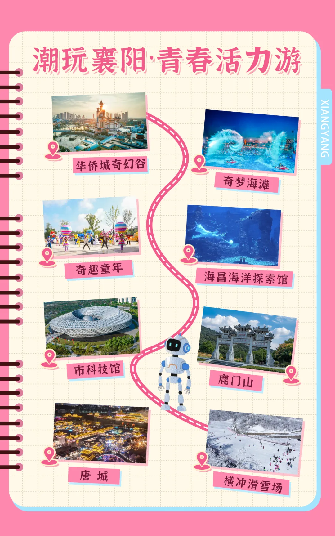 线路简介:潮玩襄阳,解锁青春新次元!华侨城奇幻三园点燃欢乐引擎,海洋馆与科技馆装满奇妙知识。午后登鹿门山沐诗风,入夜闯唐城醉霓裳。冬天更有横冲滑雪场,纵情冰雪之上。这里是乐园,亦是课堂。