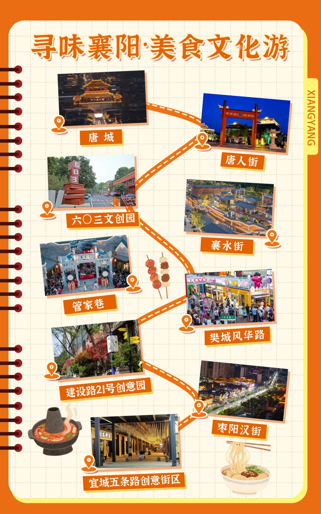 线路简介:从唐城胜景到六〇三文创园的文艺烟火,从晨间“过早”到夜宵江湖,每一口都饱含故事的温度。再转进樊城风华路与建设路创意园,传统小吃与时尚餐酒奇妙碰撞。更有枣阳汉街的古朴风味与宜城创意街区的活色生香。这条路线串起的不仅是美食地图,更是城市记忆与人间烟火的温暖共鸣。