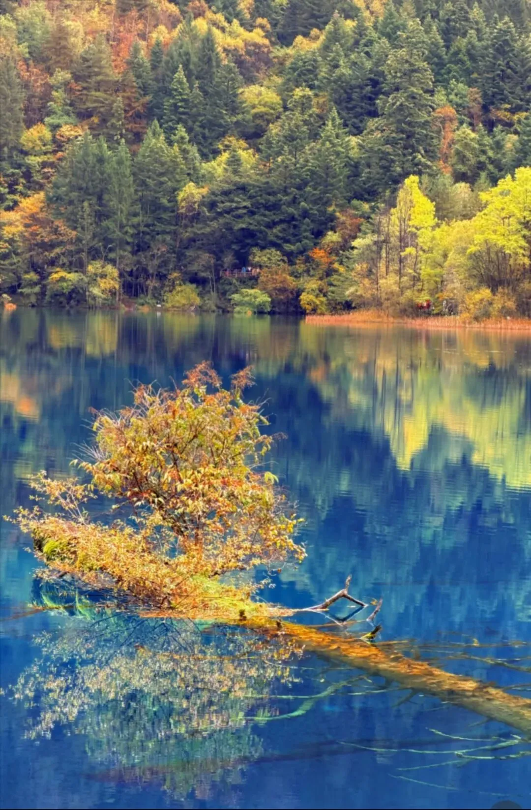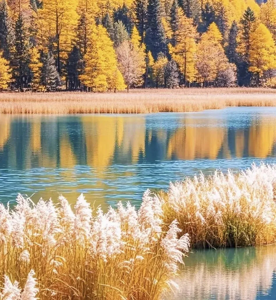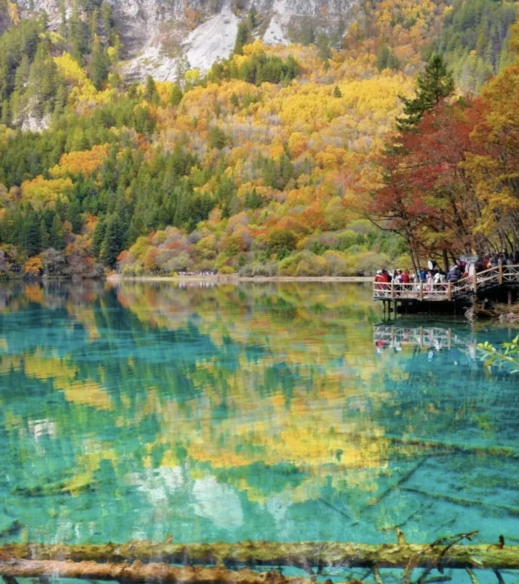 湖水澄澈到可以数清二十米深处每一根沉木的年轮,水面却倒映着金黄连绵的雪山秋林。动与静,澄澈与斑斓,都在这一片水中和解了。