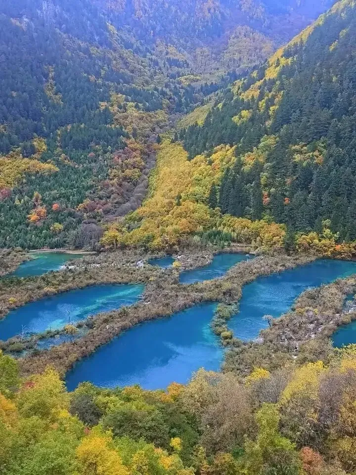 九寨沟有108个高山湖泊,被人称“海子”,湖水因富含矿物质和水生植物,呈现出令人难以置信的蓝、绿、碧、青等多种颜色。