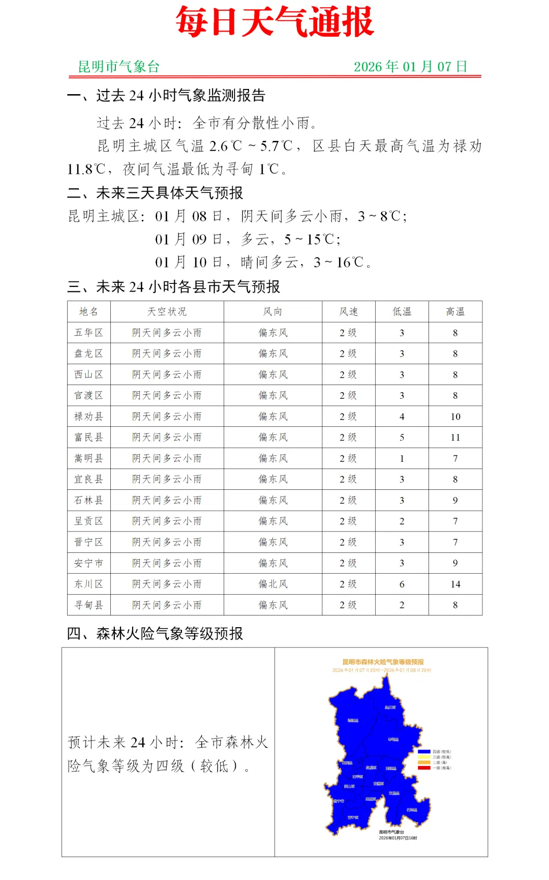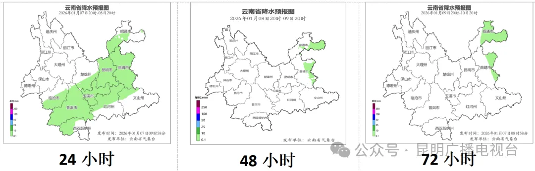 1月7日20时到1月8日20时:昭通市南部、曲靖市东部阴有小雪或雨夹雪,曲靖市西部、昆明市、玉溪市、文山州北部、红河州北部、普洱市、西双版纳州、临沧市、楚雄州南部阴天间多云局部有小雨,其他地区多云间晴。