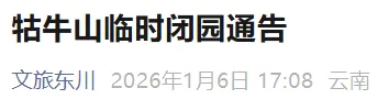 目前牯牛山气温骤变,结合后续强降温天气预警,不具备安全游览条件。为切实保障广大游客的人身安全,1月6日夜间至8日牯牛山暂停小程序预约服务。决定自本通告发布之日起实行临时闭园。已通过线上小程序预约的游客,可通过原预约渠道申请全额退款;若有行程咨询或退票疑问,可拨打牯牛山官方服务热线:0871-66256666。